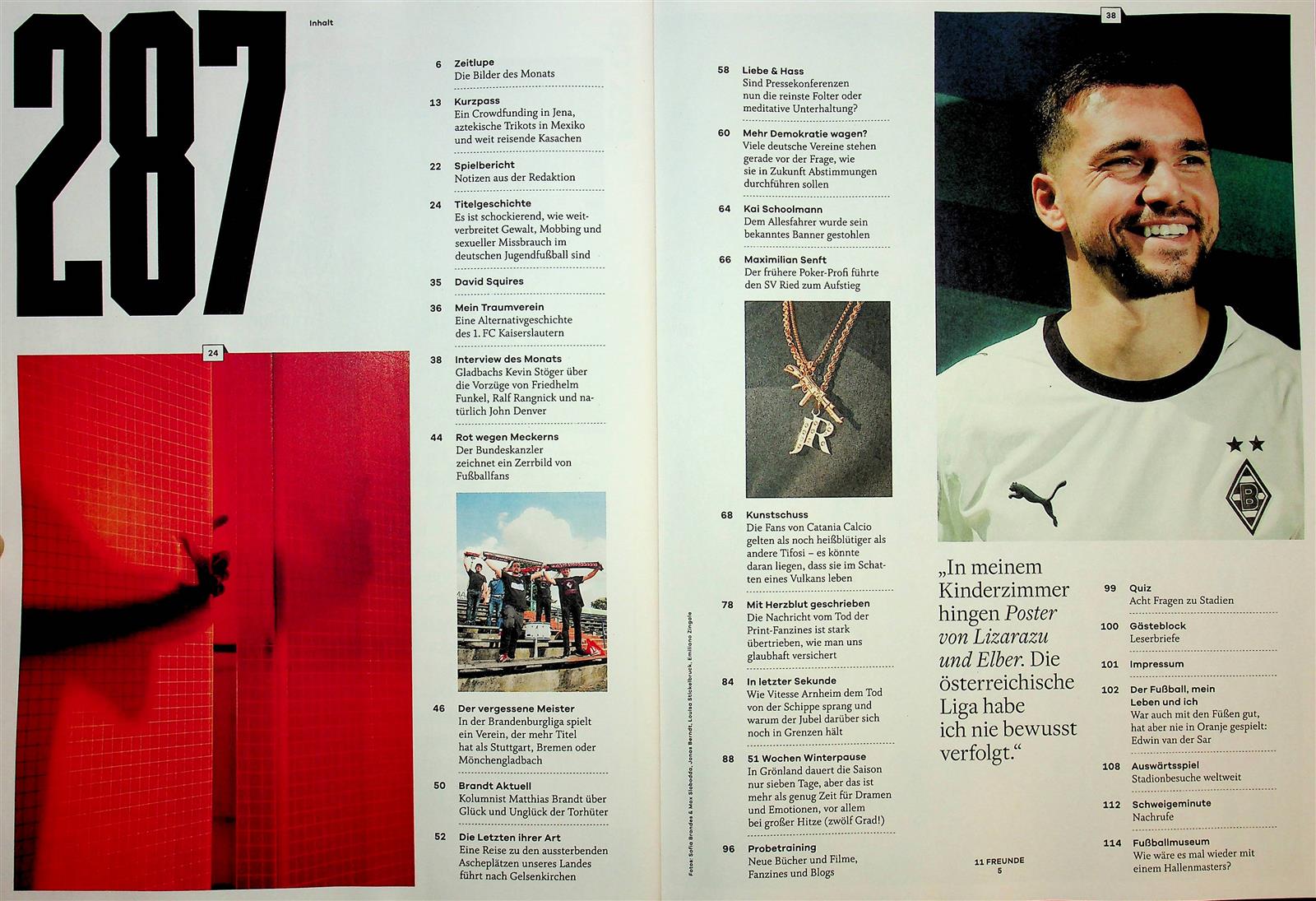 11 Freunde ist im Laufe der Zeit zu einem Kult geworden. Vom Typ her sind das lange Berichte, die liebevoll geschrieben sind und neben dem Mainstream des Fussballgeschehens ablaufen. Nicht für alle Tage, aber einmal im Monat so ein Heft über den Monat verteilt gelesen ist eine Freude