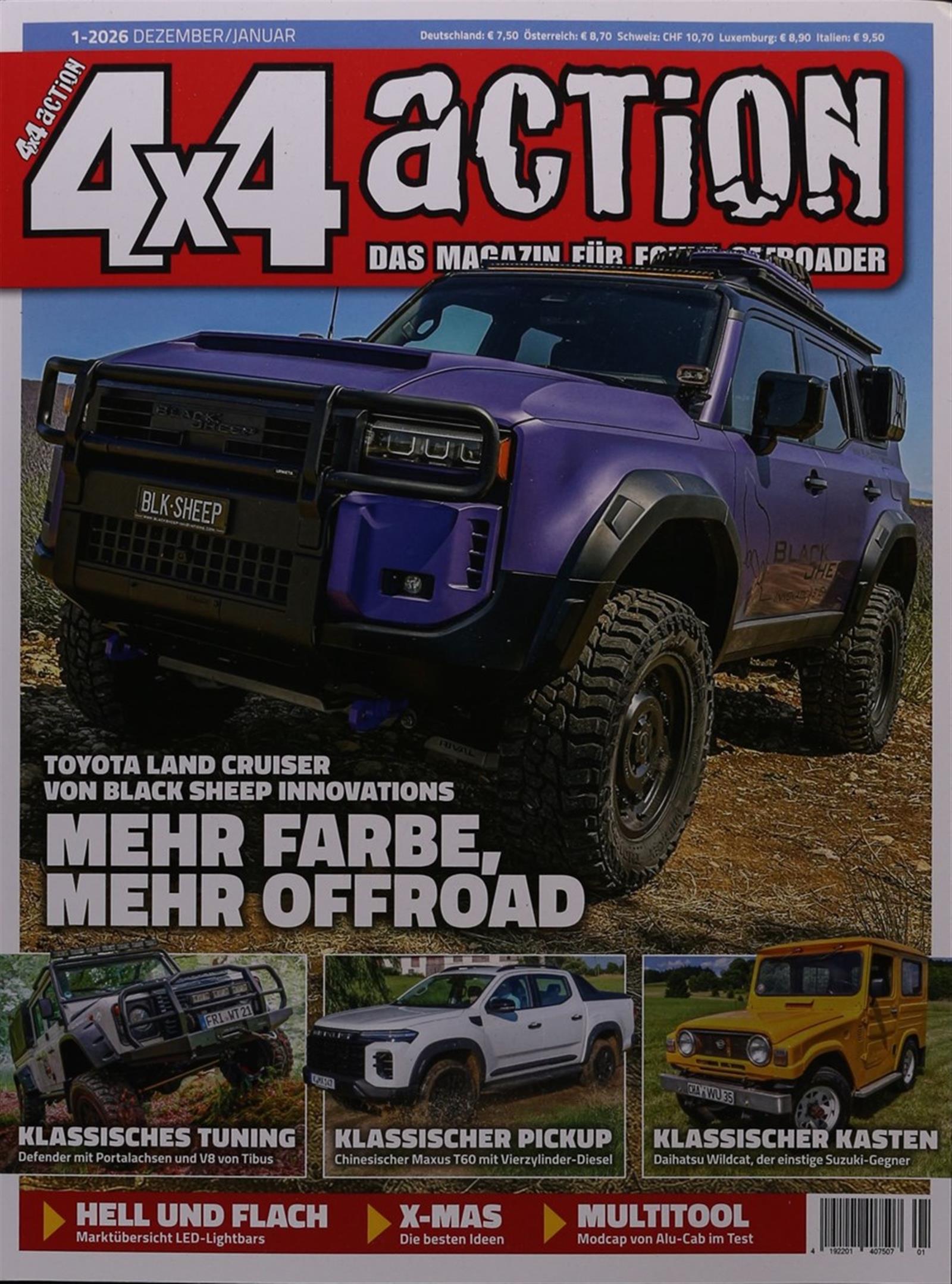 4x4 action widmet sich den Fahrzeugen, die sich jenseits des Asphalts bewegen. Neben Fahrzeugchecks gibt das Magazin Infos zu Tuning, Zubehör und Verbesserung von Geländewagen und Allrad-Fahrzeugen, und berichtet über die Szene, Wettbewerbe und Rallyes.
