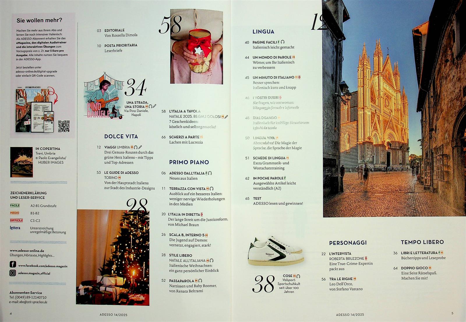Adesso kombiniert hochwertiges Sprachlernen mit abwechslungsreichen Reportagen und Beiträgen aus dem Alltag in Italien. Muttersprachliche Journalistinnen und Journalisten berichten über Politik, Gesellschaft, Reisen, Kultur, Kulinarik und Lifestyle – ergänzt durch deutsche Einstiegstexte, Vokabelhilfen, Grammatikerklärungen und praxisnahe Übungen. Ein besonderer Fokus liegt auf dem umfangreichen Sprachteil mit interaktiven Inhalten wie Übungskarten und der beliebten Rubrik “La parola del giorno”, die täglich eine neue Vokabel samt Beispielsatz liefert.