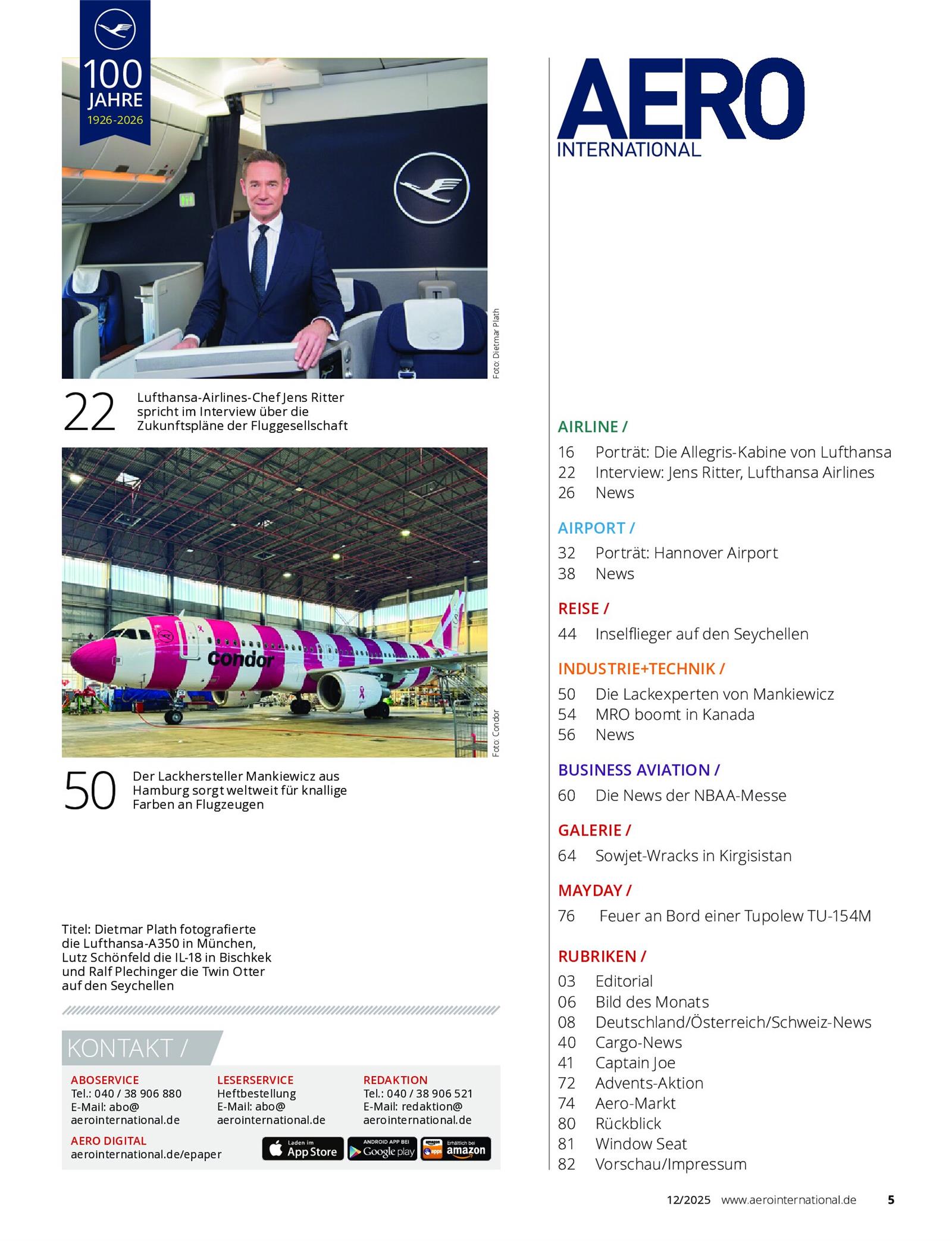 Lufthansa begeht ihren 100. Geburtstag 2026 und führt die neue Kabineneinrichtung Allegris ein, die erstmals in der A350 zum Einsatz kommt. Ein Praxisbericht, Interview mit CEO Jens Ritter und Einblicke in die Flottenmodernisierung prägen diesen Schwerpunkt.