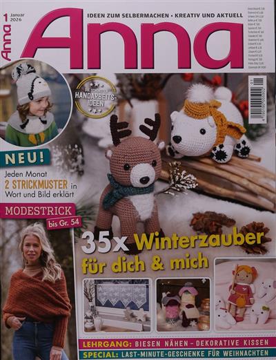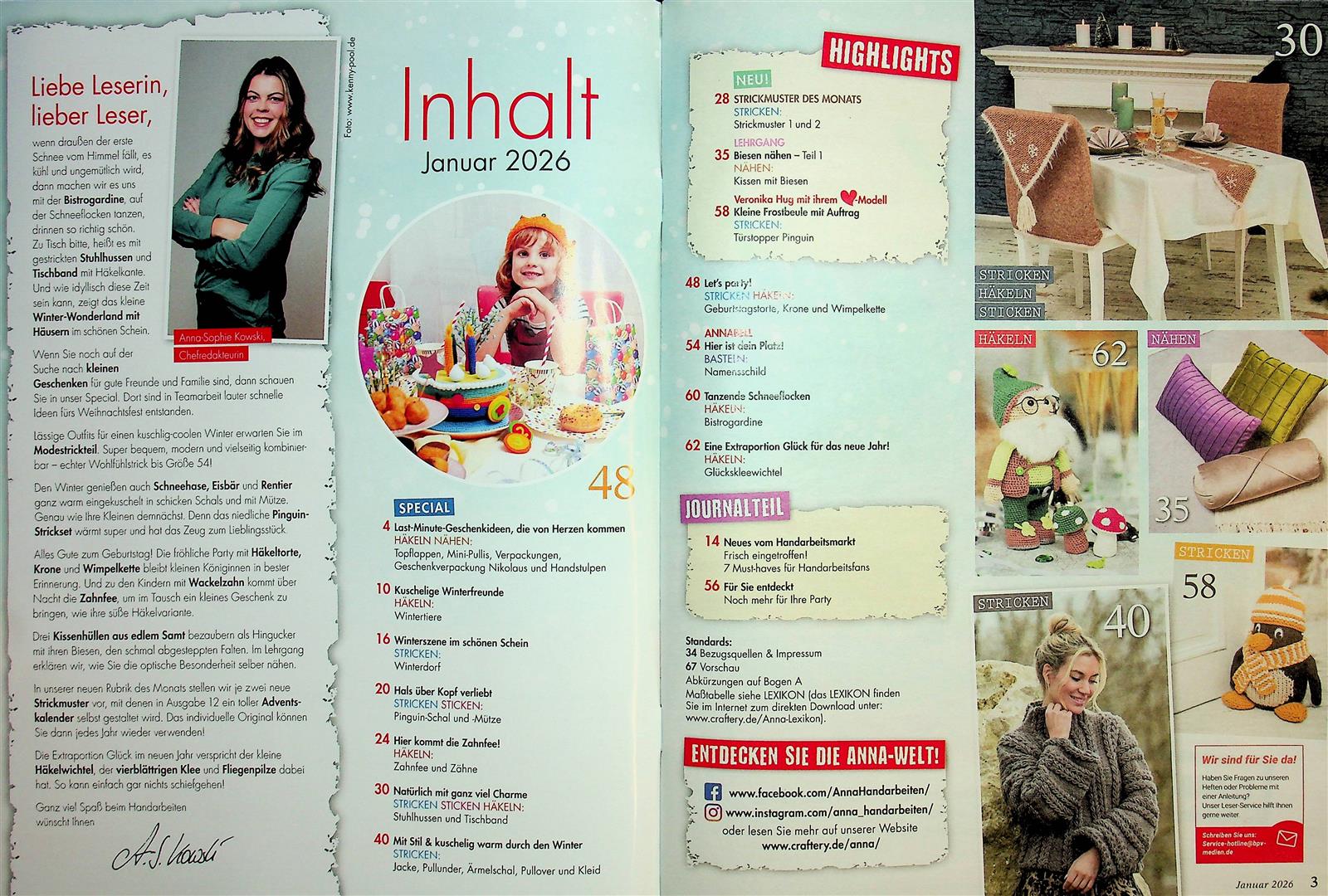 Neben den erwähnten Handarbeitstechniken bietet Anna, eine der ältesten Handarbeitszeitschriften Deutschlands, die dazugehörigen Anleitungen und Vorlagen und stellt auch hübsch anzusehende Handarbeiten für Kinderhände vor. Da hätte vielleicht der erwähnte Topflappen auch noch seine Anhängerschaft gewonnen. Mit einer breiten Ideenpalette stellt das Heft liebevolle Handarbeiten vor, die von modernen Wohnaccessoires und Dekorativem zum Selbermachen für alle gängigen Handarbeitstechniken geeignet sind. Dazu finden Sie in der Anna Anleitungen für Pullover, Jacken und Accessoires für die Anfängerin bis hin zur geübten Handarbeiterin. Das Magazin schreibt einen Strickwettbewerb aus und organisiert Strickreisen z.B. nach Salzburg. Frau Christine Müller, die Chefredakteurin der Anna, spürt die neuesten Trends für Sie auf, begeistert für ausgefallene Klassiker und behält den Überblick über die Vielseitigkeit der Handarbeiten.