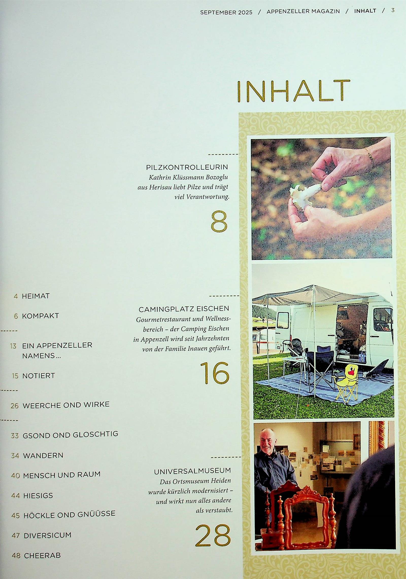 Das Appenzeller Magazin bietet eine breite Palette an Inhalten, die sowohl lokale als auch überregionale Themen abdecken. Leser können sich auf spannende Artikel über die Kultur und Traditionen der Appenzeller Region freuen, sowie auf informative Berichte über aktuelle Ereignisse und Entwicklungen. Neben Lifestyle-Themen, wie Kulinarik und Freizeitgestaltung, werden auch gesellschaftliche und wirtschaftliche Fragestellungen behandelt. Das Magazin legt Wert auf hochwertige Fotografie und ansprechende Gestaltung, um die Leser visuell zu begeistern. Zudem finden sich regelmäßige Interviews mit interessanten Persönlichkeiten aus der Region, die Einblicke in deren Leben und Wirken geben. So bleibt das Appenzeller Magazin stets relevant und unterhaltsam für seine Leserschaft.