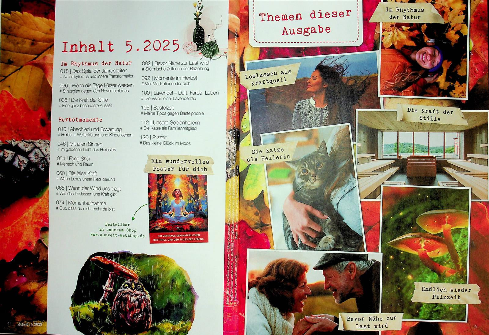 Die Zeitschrift Auszeit bietet eine vielfältige Auswahl an Inhalten, die sich auf Entspannung, Wellness und persönliche Entwicklung konzentrieren. Leser finden informative Artikel über die neuesten Trends in der Gesundheits- und Wellnessbranche sowie praktische Tipps für mehr Achtsamkeit im Alltag. Zudem werden inspirierende Reiseberichte und Empfehlungen für erholsame Urlaubsziele präsentiert, die dazu einladen, dem stressigen Alltag zu entfliehen. Kreative DIY-Ideen und Rezepte fördern die Selbstfürsorge und laden dazu ein, die eigene Kreativität zu entfalten. Interviews mit Experten aus den Bereichen Psychologie, Ernährung und Fitness bieten zusätzlich wertvolle Einblicke und Ratschläge. Die Zeitschrift Auszeit ist somit nicht nur eine Quelle der Inspiration, sondern auch ein Begleiter für jeden, der nach mehr Balance und Zufriedenheit im Leben strebt.