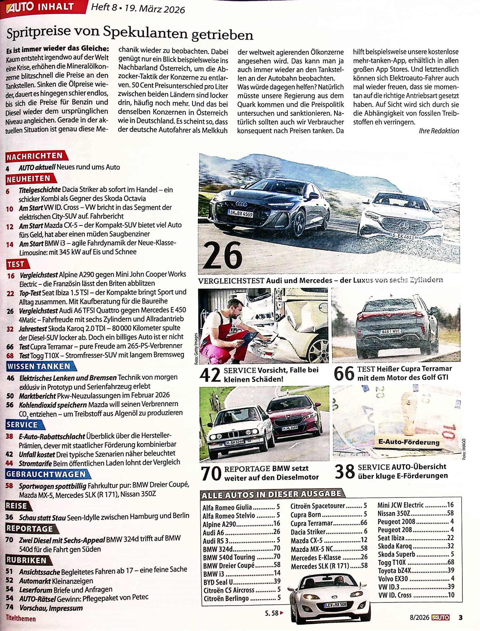Die Reportage stellt sieben Autos vor, die sich durch besondere technische oder konzeptionelle Merkmale abheben: Der Fiat 500e 3+1 bietet eine zusätzliche Fondtür; der Honda Jazz punktet mit vielseitigen Magic Seats; der KGM Musso ist ein seltener E‑Pickup; der Mazda 3 bleibt dem großvolumigen Saugmotor und manueller Gangwahl treu; der Subaru Forester kombiniert Boxermotor und permanenten Allrad; der Toyota Mirai fährt mit Brennstoffzellen‑Wasserstoffantrieb; der VW ID. Buzz ist das moderne Elektro‑Bulli‑Konzept. Jedes Fahrzeug wird hinsichtlich Praxistauglichkeit, Besonderheiten und Zielgruppen analysiert. Die Serie lädt Leser ein, ungewöhnliche Lösungen kennenzulernen und abzuwägen, welche Innovationen echten Mehrwert bieten.