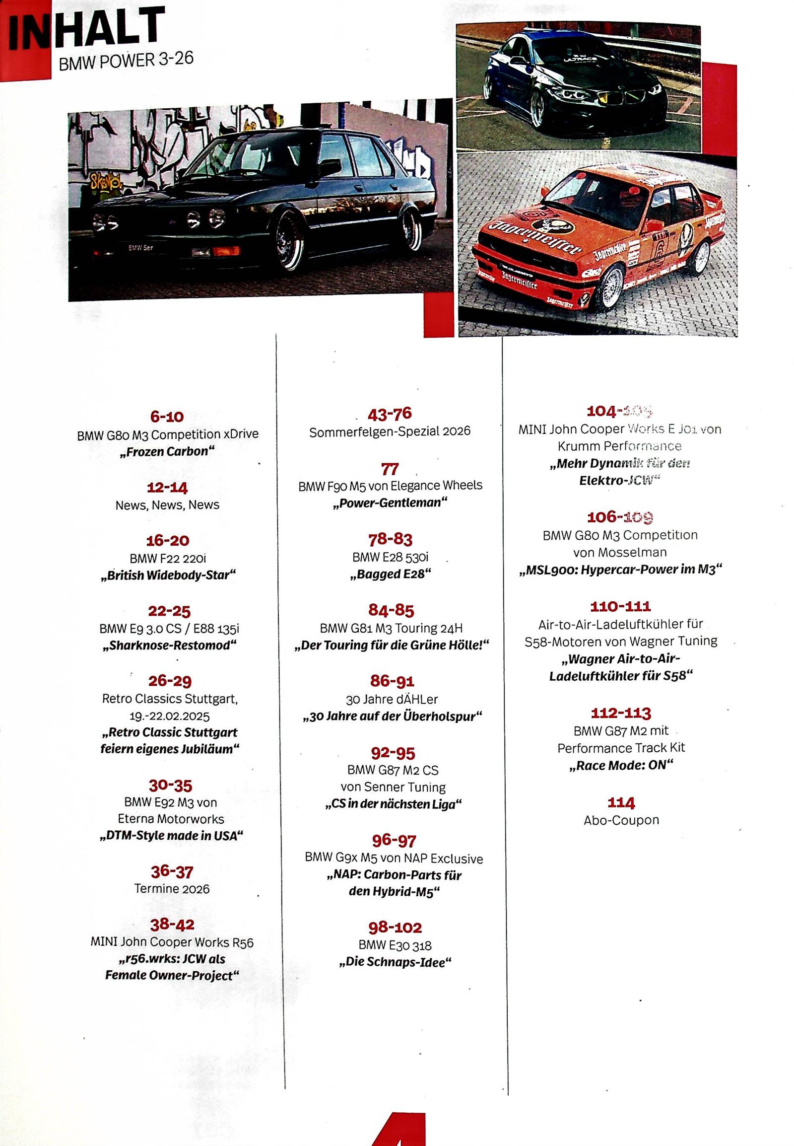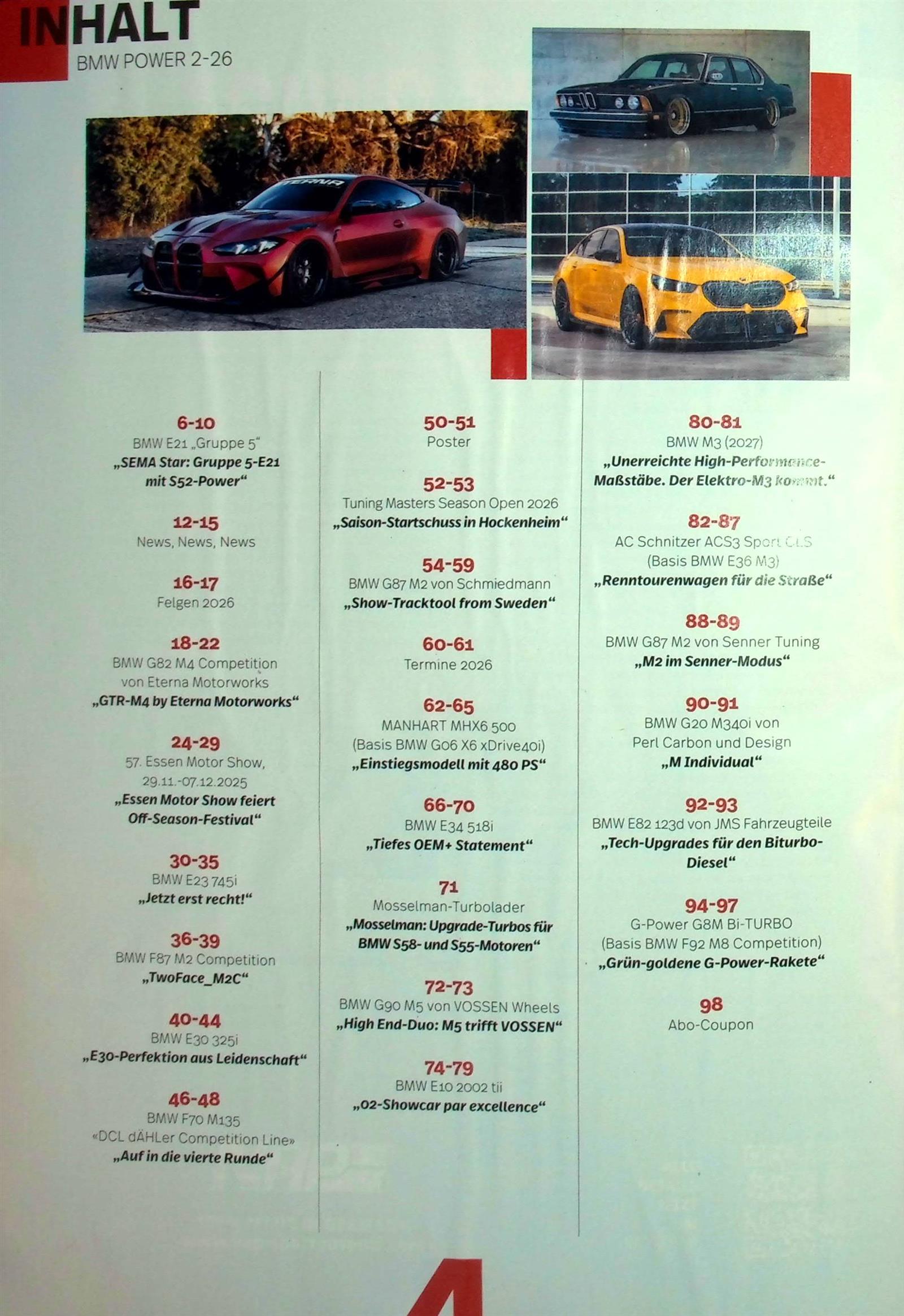 Das absolute Szene-Blatt der BMW-Community! BMW Power ist Marktführer und berichtet alle 2 Monate auf 100 Seiten aus der facettenreichen Tuning-Welt rund um die Modelle aus München.