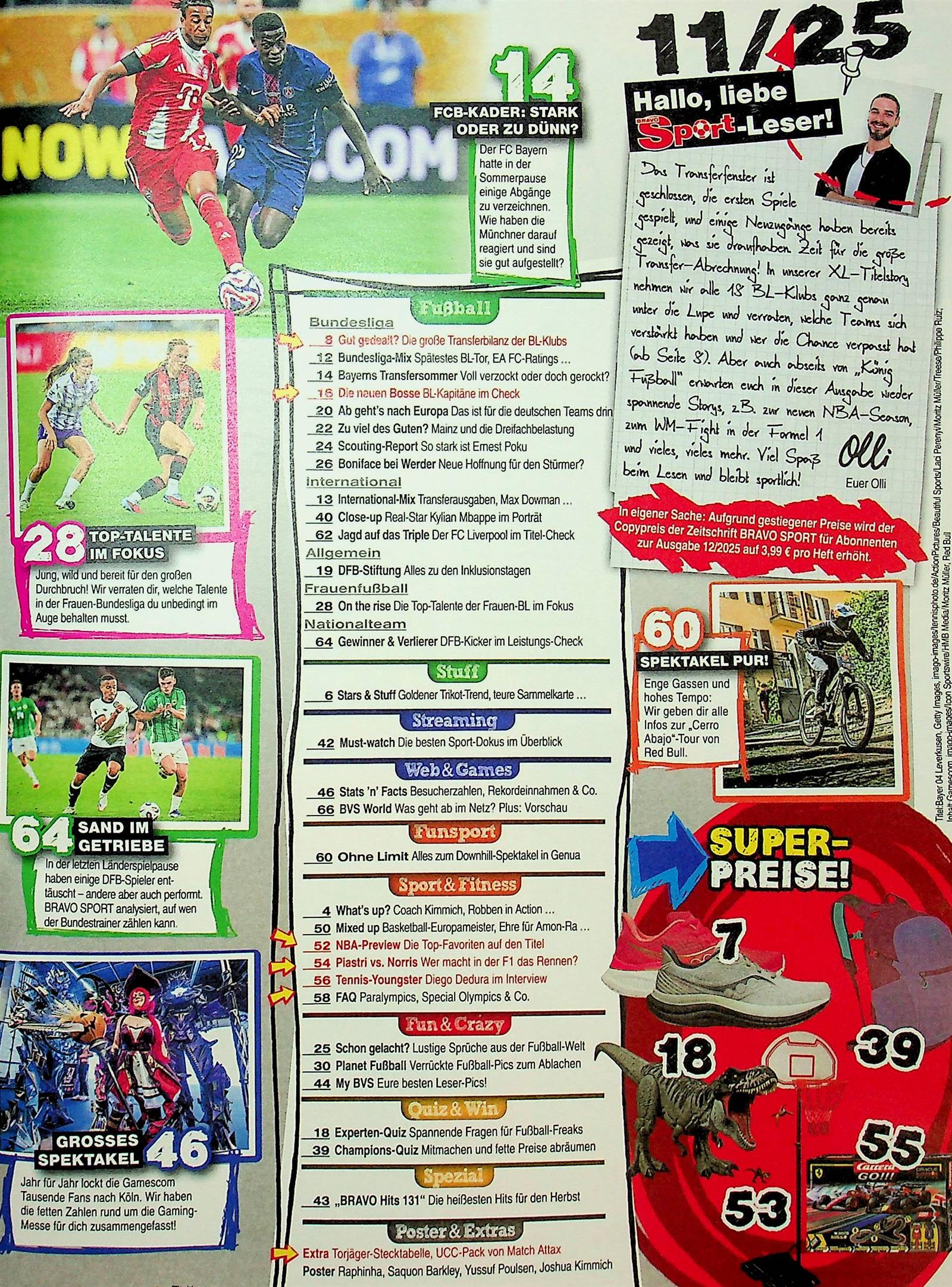 Mit ihrer spannenden, informativen und hochwertig recherchierten Berichterstattung zum Lieblingsthema vieler junger Sport-Fans – Fußball – ist die Bravo Sport eine der wichtigsten Infoquellen für alle sportlichen Ereignisse. Das macht die Jugendzeitschrift zu einer guten Alternative zu den großen und etablierten Fußballmagazinen. In jeder Ausgabe dreht sich alles um Fußball-Stars, Mannschaften, Bundesliga und internationale Ligen, Transfers, Traumtore, Hintergrundgeschichten aus dem Privatleben der Promis und viele weitere News aus der Welt des Fußballs. Auch die zweite Bundesliga kommt in der Bravo Sport nicht zu kurz. Zudem wird immer neues Equipment und die neueste Mode auf dem Spielfeld vorgestellt. Und auch die Leserinnen und Leser kommen im Forum zu aktuellen Fußball-Themen zu Wort.