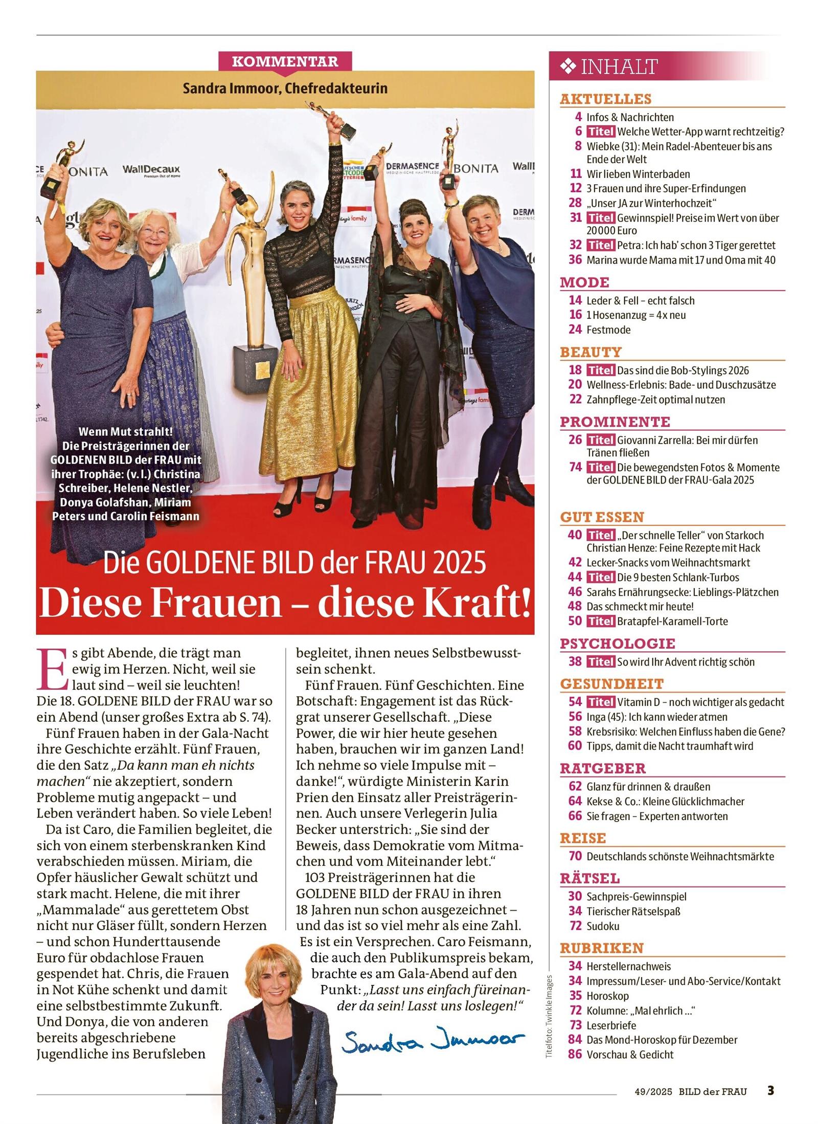 Die Bild der Frau vergibt jährlich einen Preis namens „Die Goldene Bild der Frau“. Der Grundgedanke hinter dem Award besteht darin, Frauen auszuzeichnen, die ehrenamtlich oder mit Zivilcourage außergewöhnliche Leistungen für die Gesellschaft erbracht haben.