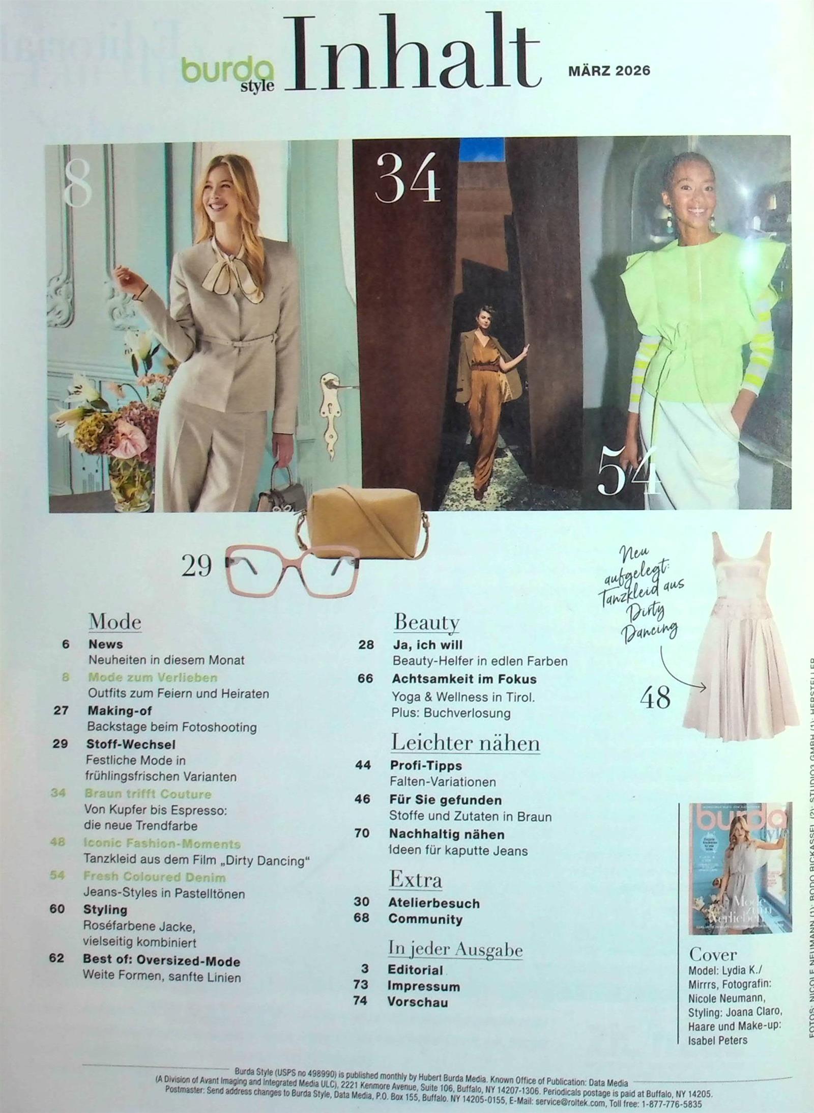 Ein Statement für Mode, Stilberatung, Nähen, Schnittmuster und DIY-Know-how – Burda Style zählt zu den weltweit meistgelesenen Mode- und Nähzeitschriften. Mit ihren Inspirationen steht sie für Kreativität, Individualität und Persönlichkeit abseits der Kleidung von der „Stange“. Sie ist ein Modemagazin zum Mitmachen. Anleitungen für verschiedene Arten von Handarbeiten – Schwerpunkt Nähen – machen Lust, gleich loszulegen. Damit es auch immer funktioniert, sind alle Details in den Schnitten und Anleitungen akribisch notiert.