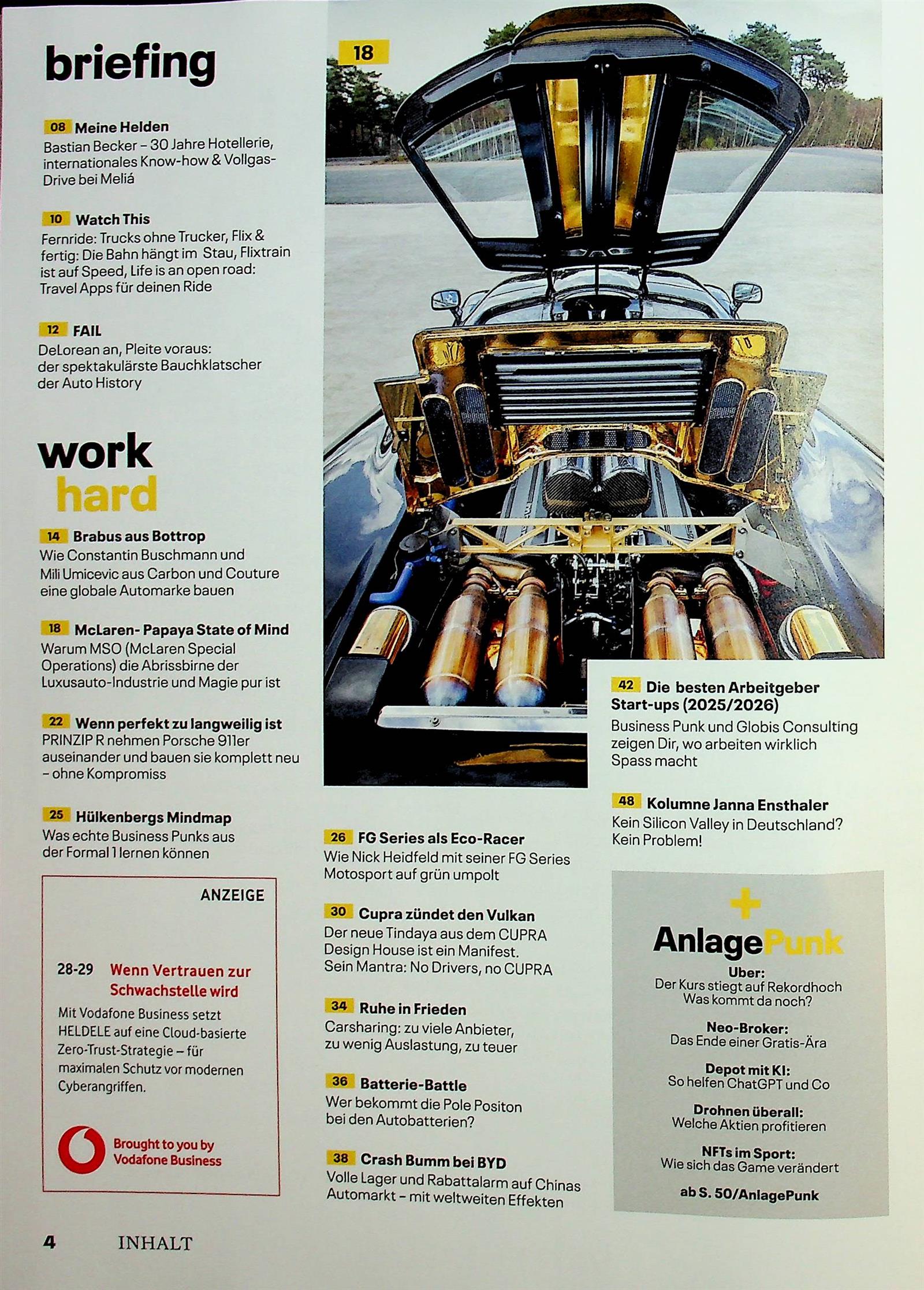 “Work hard, play hard“ – so lautet das Motto der Business Punk. Gemeint ist, dass auf der einen Seite Geschäftsideen oder neue –modelle gezeigt werden, aber auch die angenehmen Aspekte des Lebens nicht zu kurz kommen. So finden sich beispielsweise Artikel über Start-Ups und deren Unternehmenskultur sowie Businessmodell aber auch Anregungen aus den Bereichen Mode, Film und Musik in dem Heft. Auf der Titelseite werden meist Innovatoren aus der Branche abgebildet und deren Story erzählt, doch finden sich auch kleinere Artikel und News.