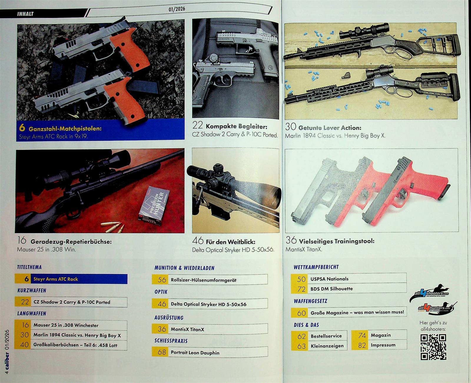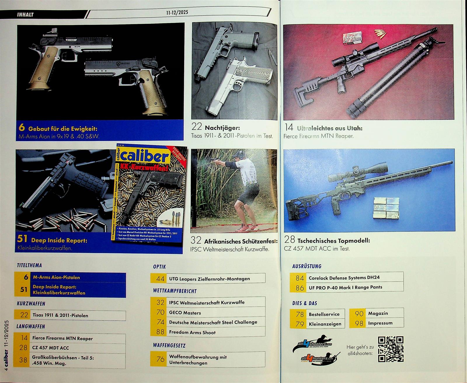 In- und ausländische Meister aus dem Sportbereich, aber auch professionelle Waffenträger, berichten aus ihrer täglichen Praxis. Das Testteam besteht aus international anerkannten Experten. Caliber zeichnet sich insbesondere durch seine schnörkellosen, praxisbezogenen Tests aus.