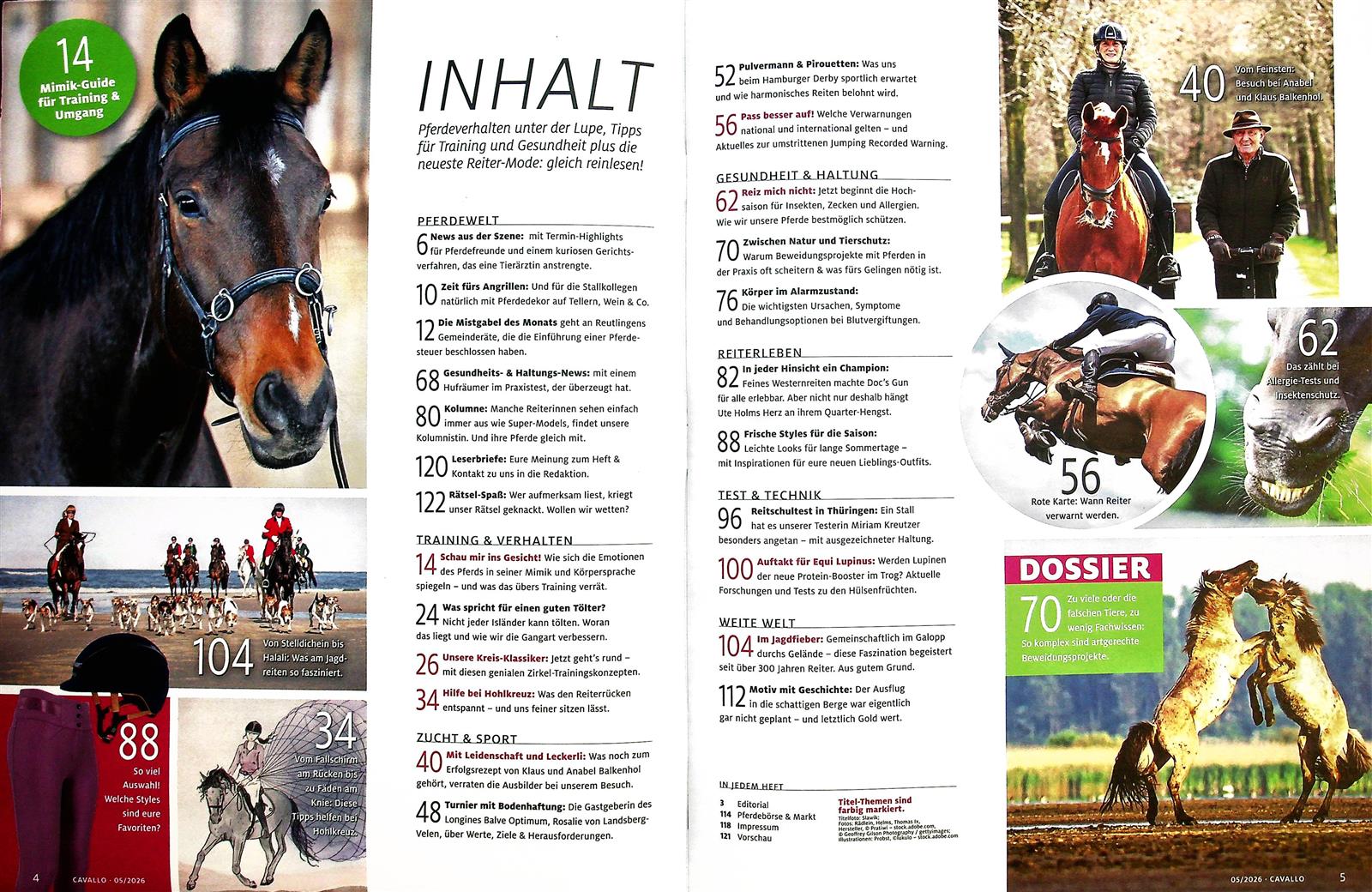 Die Zeitschrift Cavallo bietet ein vielfältiges Spektrum rund ums Pferd: fundierte Berichte zu Reitweisen und Ausrüstung, praxisnahe Trainingsanleitungen für Reiter und Pferd, sowie Fachbeiträge zu Gesundheit, Tiermedizin und Hufpflege. Porträts von Pferderassen, Interviews mit Experten, Reportagen von Turnieren und Geschichten aus dem Alltag runden das Angebot ab. Testberichte vergleichen Sättel, Trensen und Pflegemittel, während Tipps zur Pferdehaltung, Fütterung und Ausbildung praktische Hilfe leisten. Auch Fotostrecken, Leserfragen und Veranstaltungskalender sorgen für Abwechslung. Ziel ist, Freizeit- und Profi-Reiter gleichermaßen zu informieren und die Leidenschaft für Pferde zu fördern. Editorials beleuchten Trends, Wissenschaftler erklären neue Studien, und Kleinanzeigen verbinden Käufer und Verkäufer weltweit.