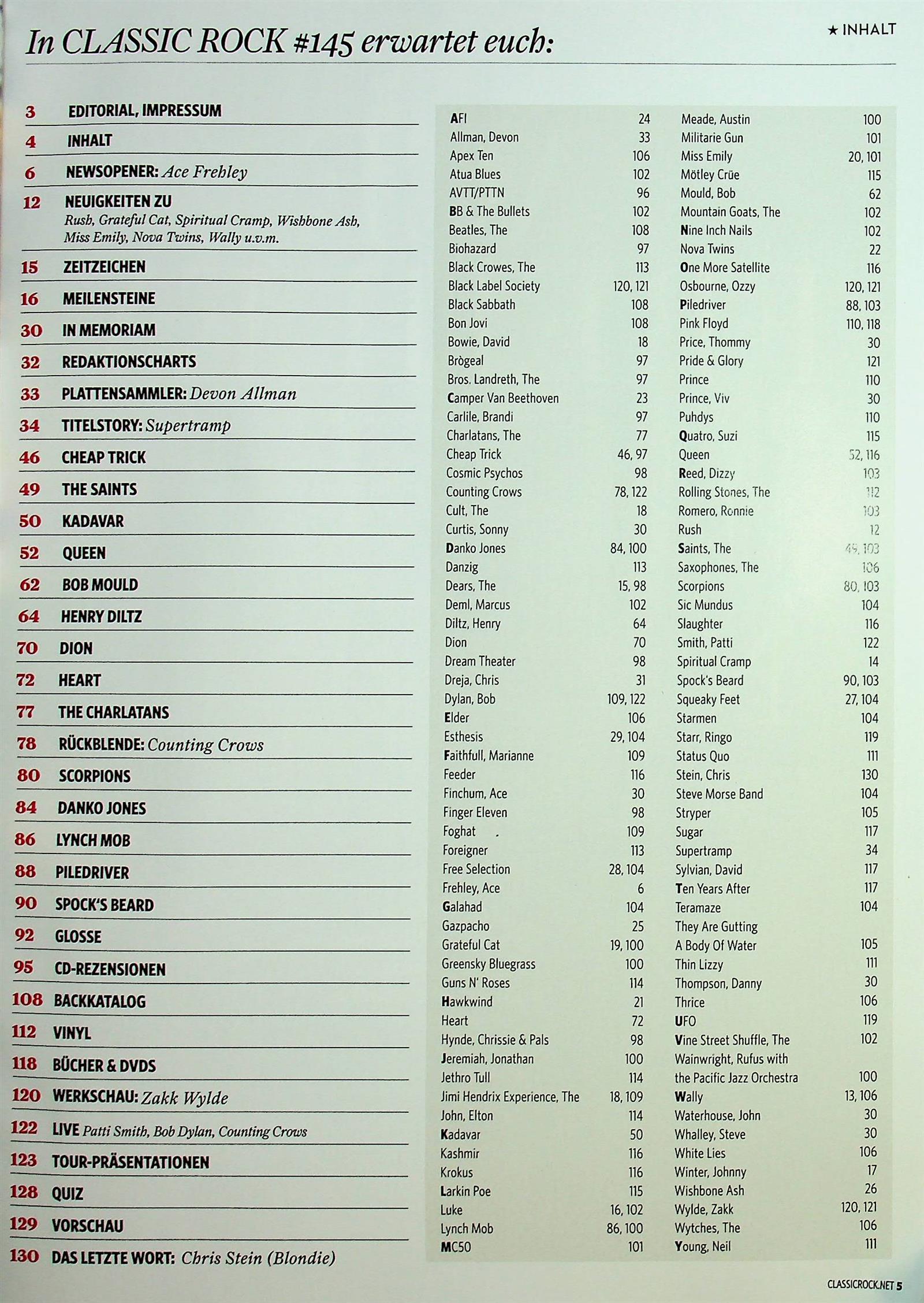 Ausführliche „Histories“ – Geschichten aus den Anfängen der Rockmusik, über Bands, die nicht nur Welterfolge performten, sondern die Welt, Generationen von Musikliebhabern prägten, besitzen einen hohen Stellenwert in der Classic Rock. Dabei reicht die Spannbreite von AC/DC bis ZZ Top, was deutsche Rockbands wie die Scorpions mit einschließt.