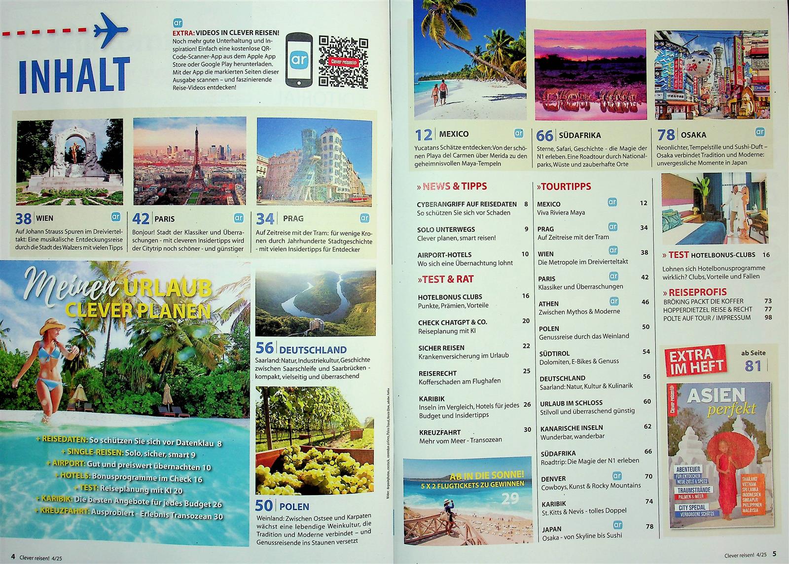 Multithematisch – mit Schwerpunkt auf Flugreisen – immer mit hohem Nutz- und Servicewert für seine Leser, Clever Reisen testet, bereist, erlebt, prüft und hinterfragt alles rund um die Reisewelt. Ob Urlaubs- oder Geschäftsreise, Städtetrip, Kreuzfahrt, Bus-, Bahn- und Flugreise die Redakteure von Clever Reisen behalten den Überblick im Angebotsdschungel und haben auf über 100 Seiten nicht nur die besten Preise für seine Leser parat.