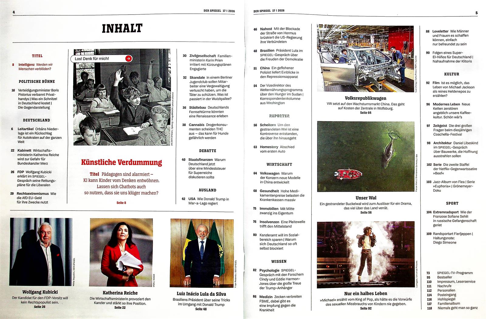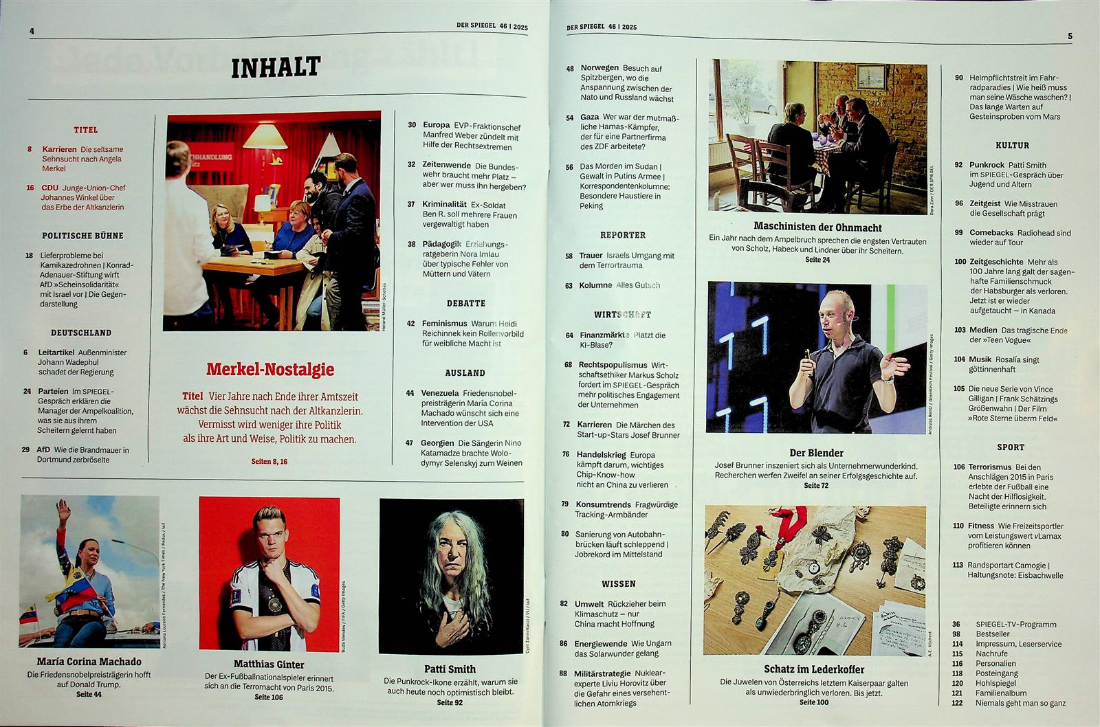 Im DER SPIEGEL Magazin finden Leser fundierte Berichte über Politik, Wirtschaft, Wissenschaft, Kultur und Sport. Jede Ausgabe widmet sich einem zentralen politischen Thema, begleitet von tiefgründigen Recherchen und Meinungsbeiträgen. Sonderhefte mit historischen oder aktuellen Schwerpunkten runden das vielfältige Angebot ab. Egal, ob es um globale Krisen oder gesellschaftliche Debatten geht – Spiegel-Leser wissen mehr.
