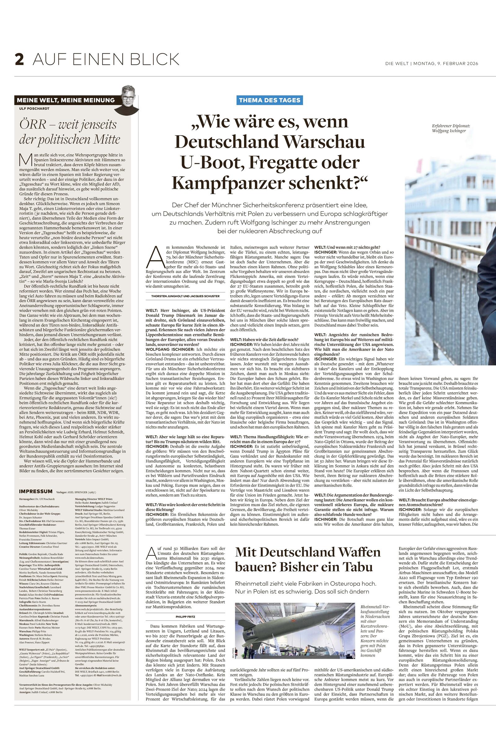 Die DIE WELT ist eine bürgerlich-konservative Tageszeitung, die wirtschaftspolitisch als „deutlich marktliberal eingestellt“ gesehen wird. Als eine der führenden Zeitungen Europas wird das im Jahr 1946 gegründete Blatt inzwischen in 130 Ländern verkauft und erscheint im Nordischen Format.