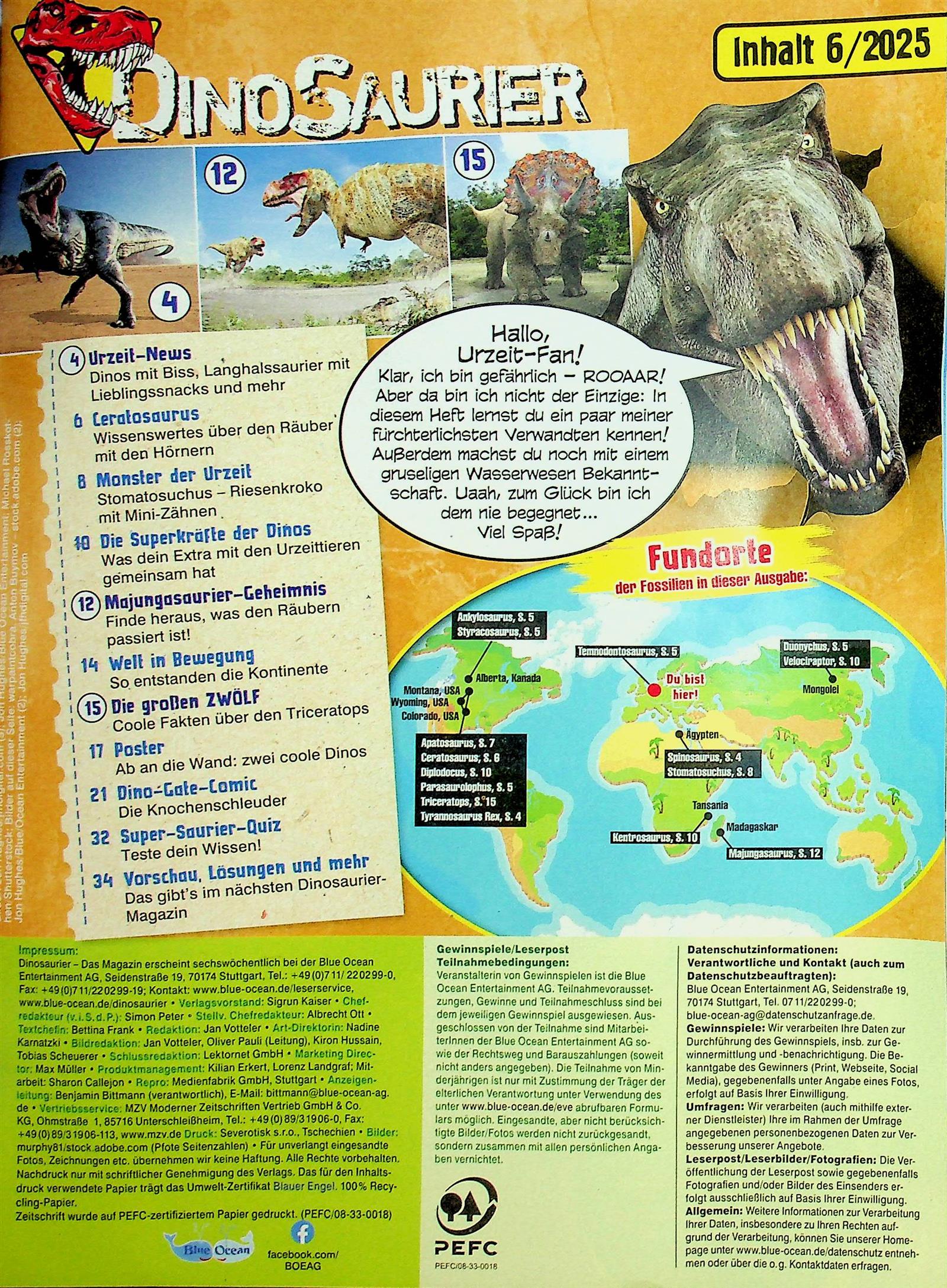 Das Magazin Dinosaurier unterstützt auf unterhaltsame Weise die kindliche Wissbegier und schildert in eindrucksvollen Kämpfen zwischen T-Rex und Triceratops oder die Angriffstaktiken von Uhtaraptors, Albertosaurus und Spinosaurus, dem größten Raubsaurier aller Zeiten. Entdeckungen neuer Dinosaurier-Arten, aktuelle Erkenntnisse über das Leben der Urzeitgiganten und viele andere Informationen gibt es in der Zeitschrift Dinosaurier. Ein Rätsel bleiben die Riesen allemal. Und so findet sich im Heft ein außergewöhnlicher Rateteil der das Expertenwissen der Kinder unter Beweis stellt. Imposante Poster und der fortlaufender Comic „Dino-Gate“, der von den tragischen Ereignissen vor 66 Millionen Jahren handelt, sind die Zutaten, die Dinosaurier zu einem spannenden Urzeitheft machen.