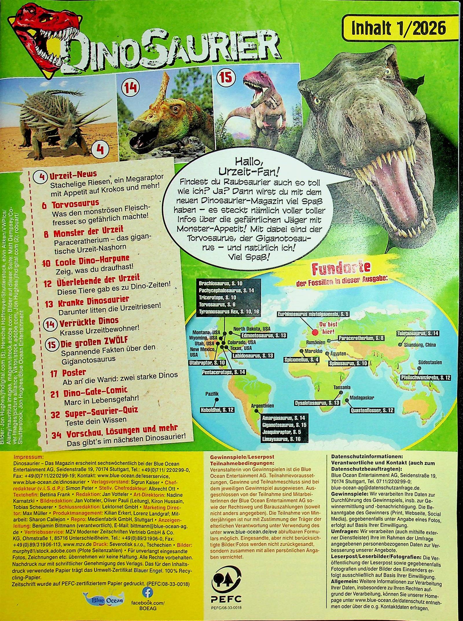 Riesige Fleischfresser, stachelige Pflanzenfresser und verrückte Dino-Fakten: Diese Ausgabe erkundet Torvosaurus, Giganotosaurus und andere Urzeitriesen. Mit Dino-Harfe, Comic, Quiz, Poster und Fossilien-Weltkarte geht es spielerisch auf Jagd nach Wissen über die gefährlichsten Jäger der Urzeit.