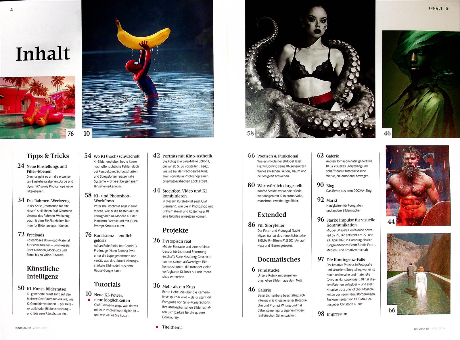 Docma ist ein kompaktes Magazin, das wichtige Praxistipps für die Bearbeitung von Fotos gibt, egal ob mit Ki oder mit den traditionellen Bildbearbeitungsprogrammen wie Photoshop oder Lightroom. Do and Don'ts der KI-Fotografie sowie die Arbeitstechniken, die technischen Praxislösungen und Photoshop-Tutorials, die in Docma zu finden sind, ermöglichen das eigenständige Training mit diesen Bildbearbeitungsprogrammen. Docma ermöglicht den Lesern diese Programme optimal zu nutzen, um z.B. das Austauschen von Hintergründen oder Hautretuschen vorzunehmen, damit kreative Montagen entstehen.