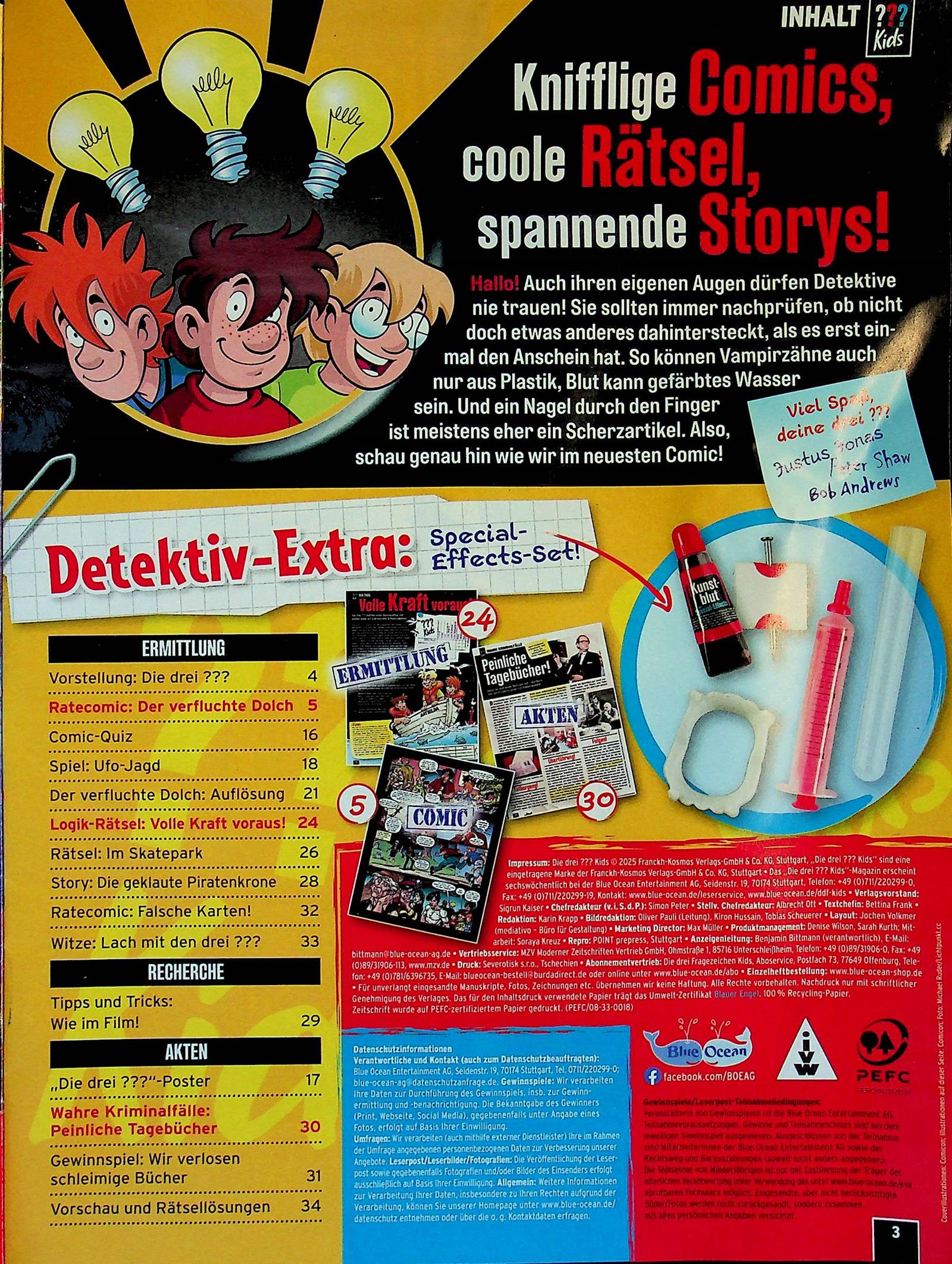 In dieser Ausgabe erleben die drei ??? Kids im Ratecomic „Der verfluchte Dolch“ ein spannendes Abenteuer. Zusätzlich warten ein kniffliges Rätsel mit „Fun im Skatepark“ und das Spiel „Ufo-Jagd“ auf die Leser:innen. Als besonderes Extra gibt es Tipps und Tricks für coole Spezialeffekte. Ein exklusives Poster rundet das Magazin ab und macht es zu einem echten Highlight für Detektivfans.