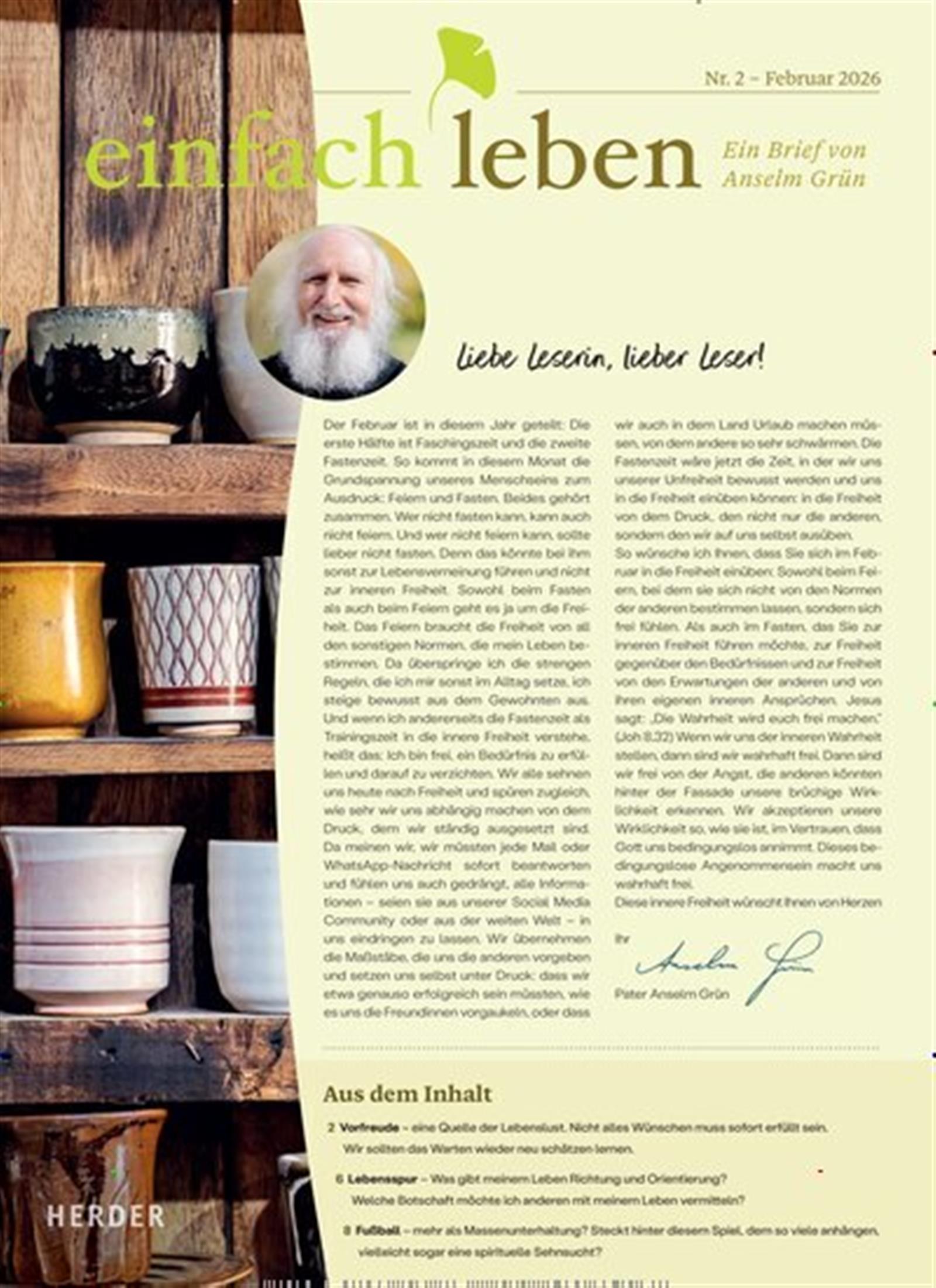 Einfach leben ist ein monatlicher Brief von Pater Anselm Grün, der den Lesern ein Gefühl von Selbst und Zugehörigkeit vermitteln soll. Er weiß, dass das Leben nicht einfach ist, aber anstatt sich darin zu verlieren, zeigt er Wege auf, diese zu überwinden, indem man mit sich selbst im Reinen ist.