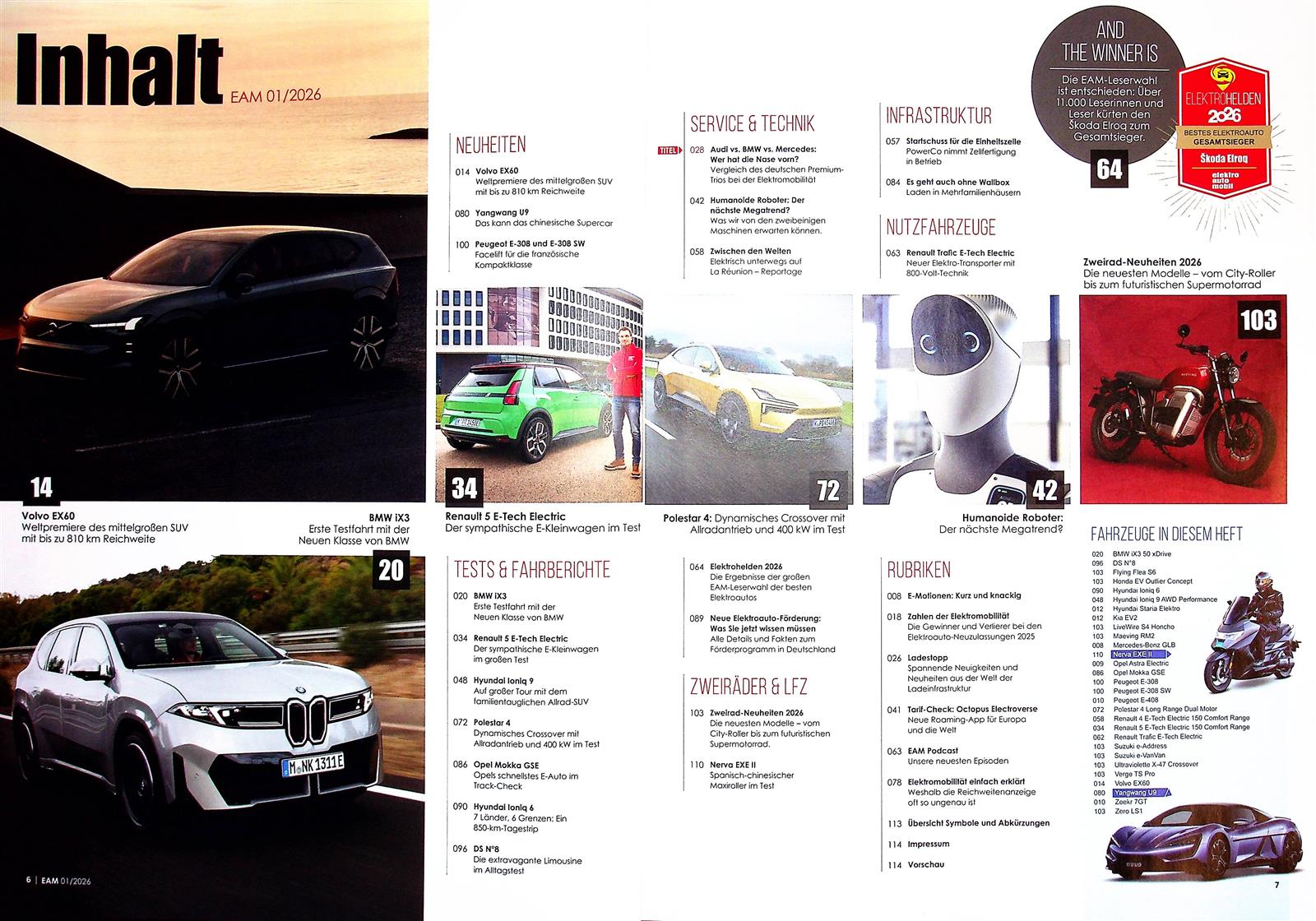 Elektroautomobil bringt in jeder Ausgabe interessante Themen und Berichte über Elektroautos, Hybridfahrzeuge und moderne Mobilität im Allgemeinen. Fahrberichte und Modellvergleiche sind Bestandteil des Magazins, sowie Artikel über Probleme oder Befürchtungen wie Batteriefeuer oder beschränkte Reichweite. Dabei werden neben Autos und Nutzfahrzeugen ebenfalls neue Elektro-Kickboards und Einrad präsentiert.