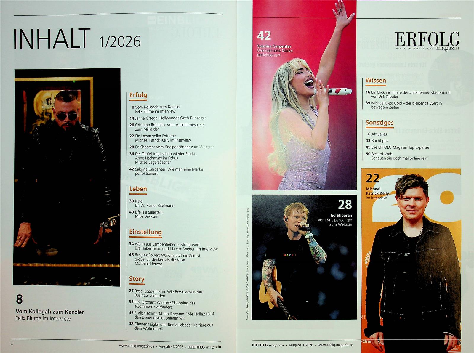 Erfolg Magazin ist viel mehr als ein Überblick über die aktuelle Situation in der Finanz- und Gesellschaftswelt. Es bietet einen einzigartigen Einblick in die Denkweise erfolgreicher Menschen und beleuchtet ihren Weg zum Erfolg. Erfolg Magazin erreicht diesen Einblick durch ausführliche Interviews mit Unternehmern, eingehende Analysen von aufstrebenden Geschäftsleuten und durch umfangreiche Recherchen über die derzeit dominierenden Märkte. Das ausgeklügelte Autorennetz der Zeitschrift ermöglicht es, dass jeder einzelne Artikel ein erhellendes Licht auf das finanzielle und soziale Bewusstsein wirft und den Lesern die Möglichkeit gibt, diese Mantras in ihrem persönlichen und beruflichen Leben anzuwenden.