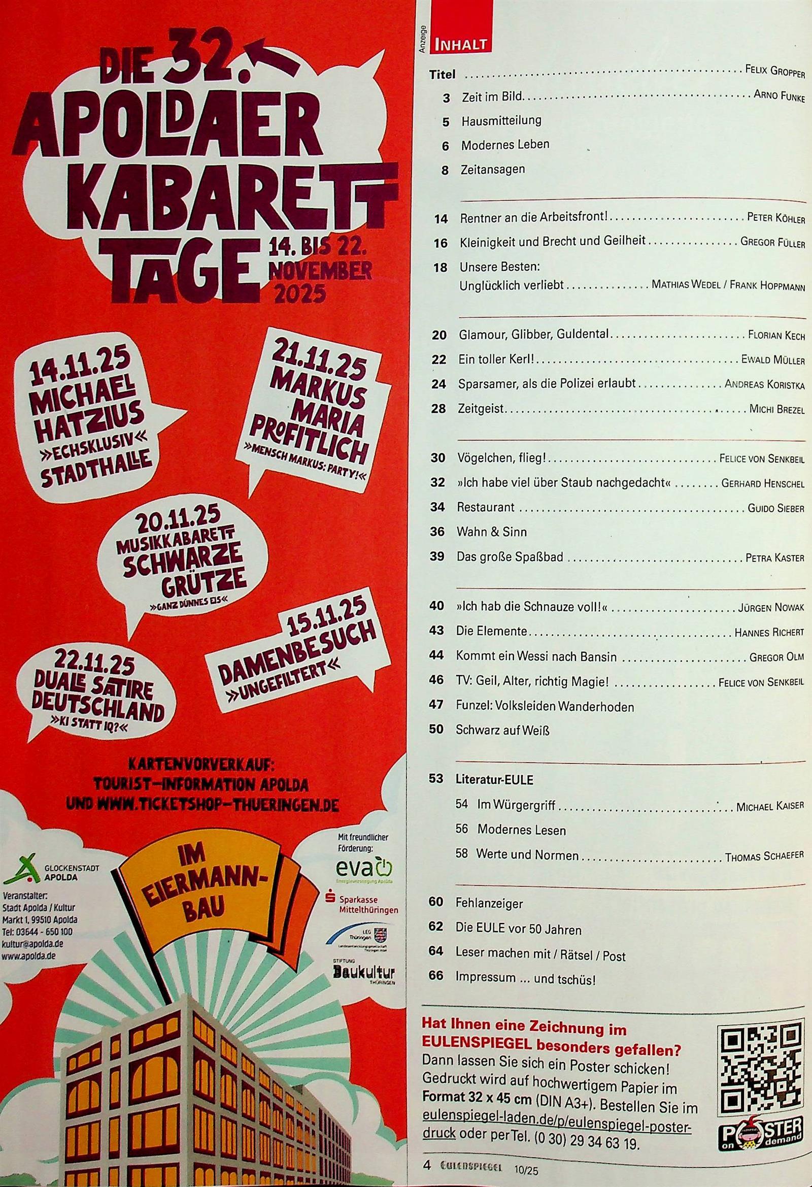 Die Zeitschrift Eulenspiegel ist vor allem für ihre Satiren bekannt und erscheint bereits seit 1954. Das Magazin war in der DDR das einzige Heft seiner Art und wurde nach der Wende weitergeführt. In früheren Jahren erschien Eulenspiegel wöchentlich, mittlerweile werden die Leserinnen und Leser einmal im Monat mit frischem Humor versorgt.