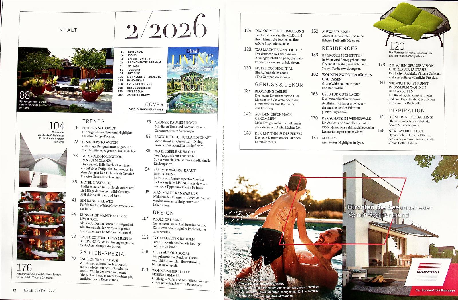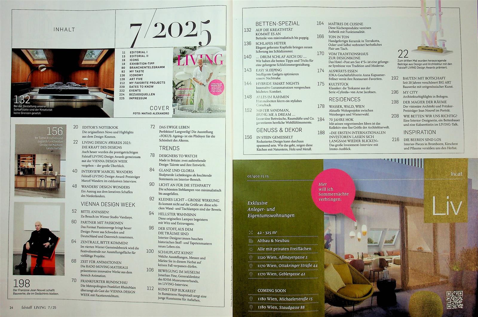 Falstaff Living ist ein Design- und Lifestyle-Magazin, das die Themen Interior-Trends, Design, Architektur und Immobilien umfasst. Das in Österreich ansässige Magazin ist nicht nur ein großartiger Stilberater und eine Inspirationsquelle, sondern auch ein Leitfaden für leidenschaftliche Experten in vielen Bereichen – wie Kunst, Architektur und Design –, die nach innovativen Analysen neuer Trends suchen. Insofern spielt es eine tragende Rolle bei der Bestimmung des Trends.