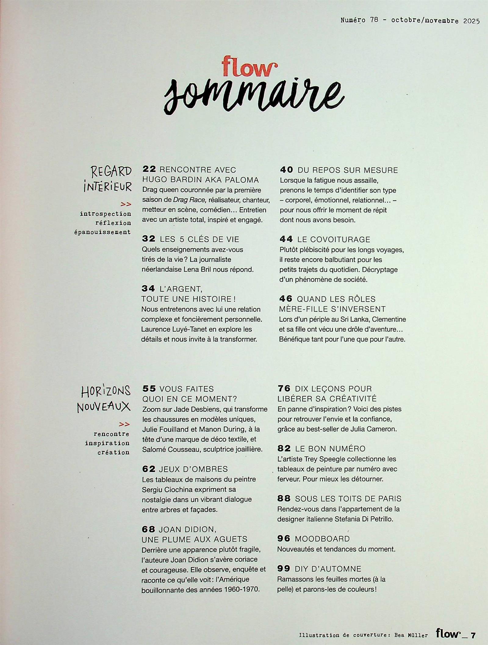 In der Psychologie bezeichnet der Flow ein Gefühl des Glücks und des Aufgehens in einer Tätigkeit. Das gleichnamige Magazin, hier in der französischsprachigen Version, wurde 2013 ins Leben gerufen bzw. aus den Niederlanden lizenziert und hat ebenfalls das Glück seiner Leserinnen und Leser zum Ziel. Die Themen sind breit gefächert, wobei das selbst ausgegebene Motto "Keine Chance für schlechte Nachrichten“ lautet.