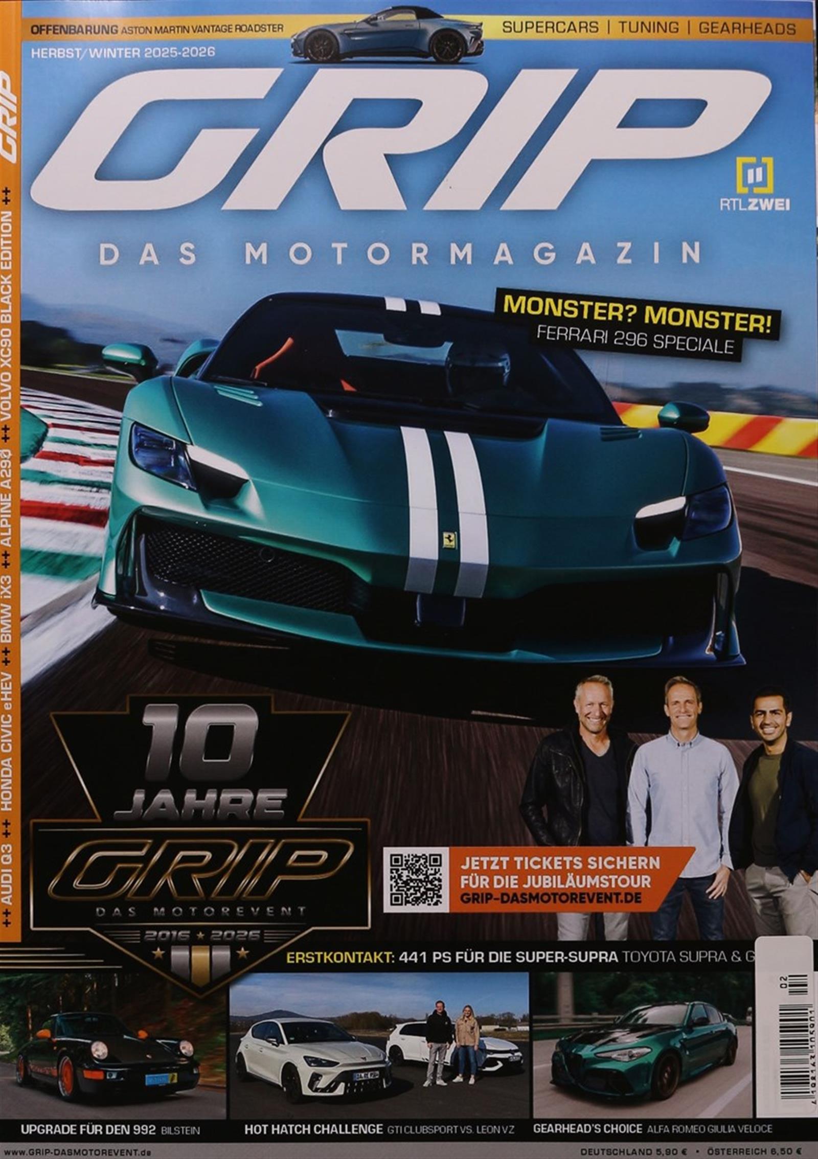 GRIP ist das Printmagazin zur gleichnamigen Fernsehserie rund um das Thema Auto, die seit Oktober 2007 wöchentlich auf RTL2 ausgestrahlt wird und sich großer Beliebtheit erfreut. Jedes Heft steht wie die Sendung für pure Action, Schnelligkeit, Adrenalin und Nervenkitzel rund ums Auto. Hier geht es konsequent um rassige Supercars, alles rund ums Tuning von Sport- und Geländewagen sowie viel Interessantes und Wissenswertes von Gearheads für die Gearheads unter unseren Lesern.