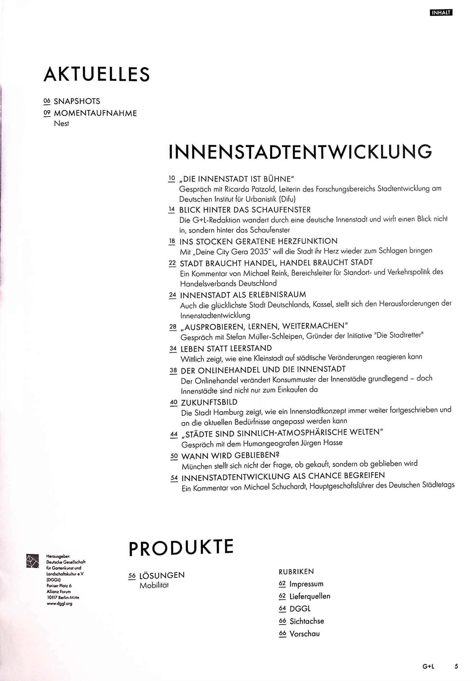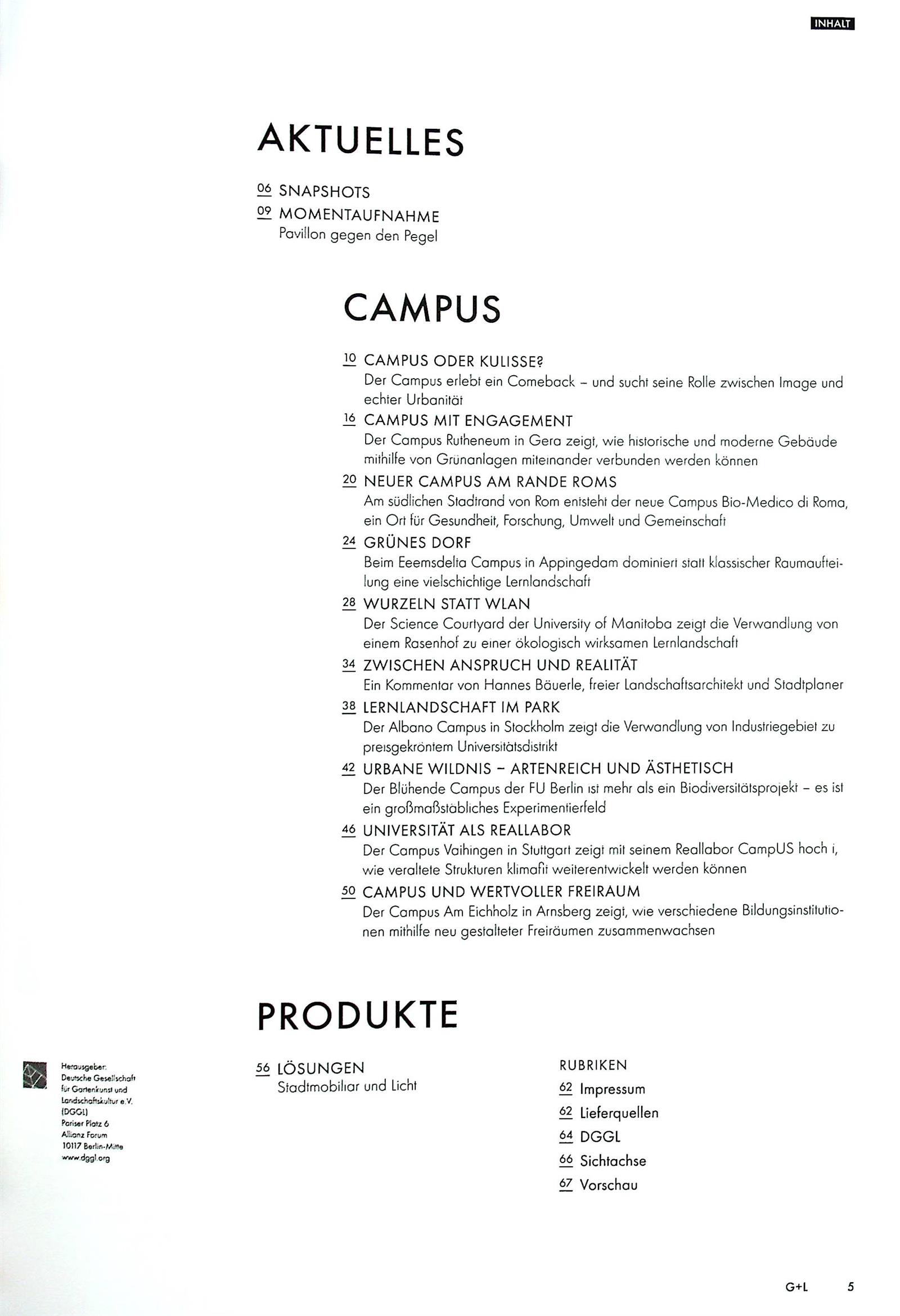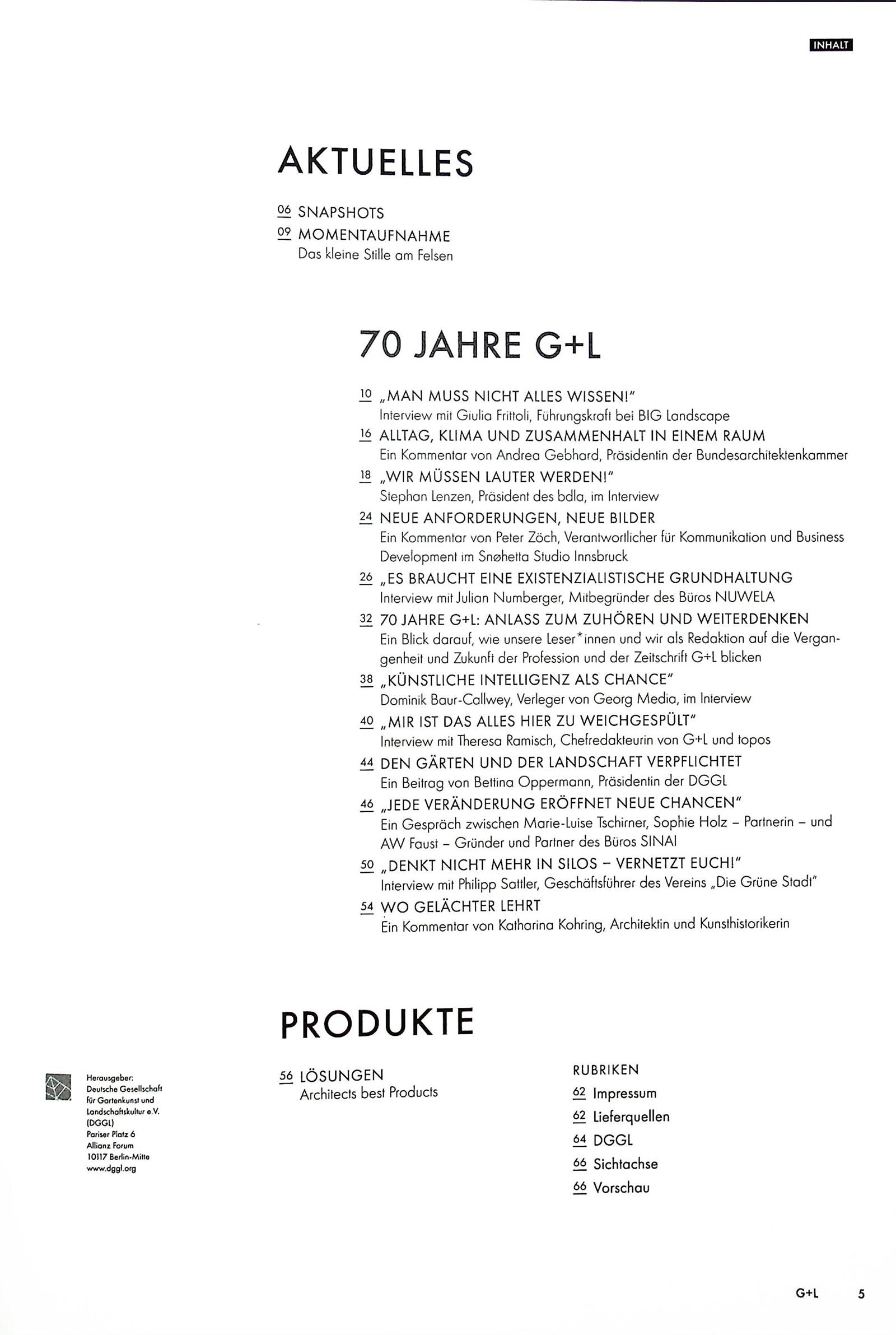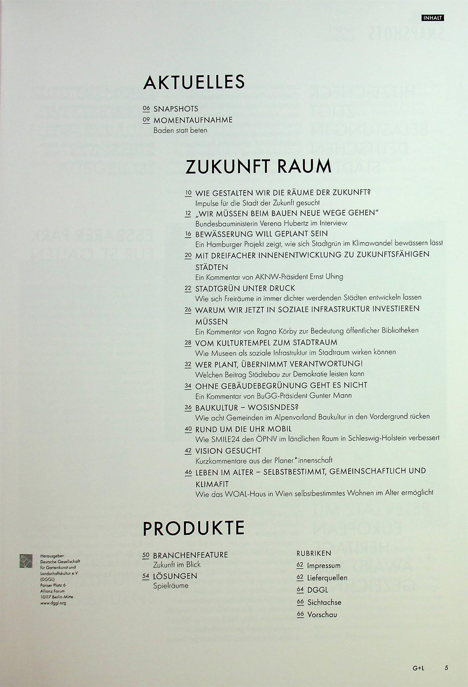 Garten & Landschaft ist die führende Fachzeitschrift für Landschaftsarchitektur im deutschsprachigen Raum. Das Magazin vermittelt den Wert und die Bedeutung herausragender Landsschaftsarchitektur und inszeniert relevante Projekte und Produkte als Highlights. Aktuelle Trends und Tendenzen werden kritisch begleitet und zusätzlich online aufgegriffen bzw. weitergeführt.