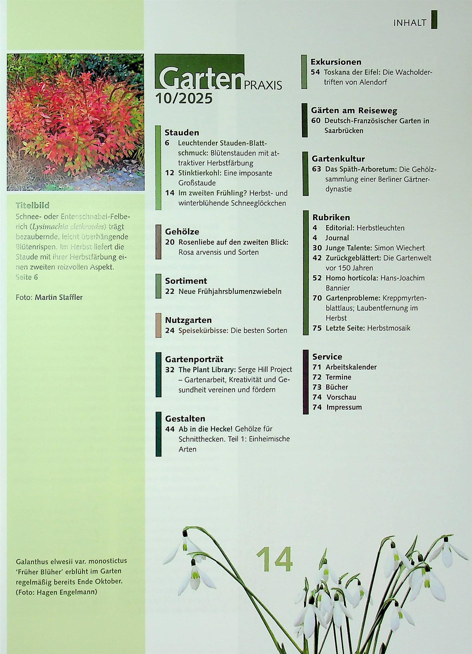 Gartenpraxis ist eine der renommiertesten Fachzeitschriften im deutschsprachigen Raum für professionelle und erfahrene Gärtner:innen. Seit Jahren überzeugt das Magazin durch fundierte Beiträge, wissenschaftlich geprüfte Inhalte und höchste gartenbauliche Fachkompetenz. Anders als klassische Gartenzeitschriften richtet sich Gartenpraxis gezielt an Personen aus der Branche sowie an ambitionierte und fachlich versierte Freizeitgärtner:innen, die sich intensiv mit der Pflanzenverwendung, Gestaltung und Pflege beschäftigen.