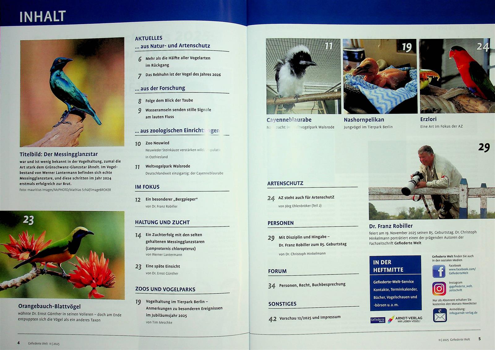 Das Fachmagazin ist eine Bereicherung für alle Vogel-Liebhaber, erfahrene Vogelhalter und -züchter und Menschen, die beruflich mit Vögeln zu tun haben.