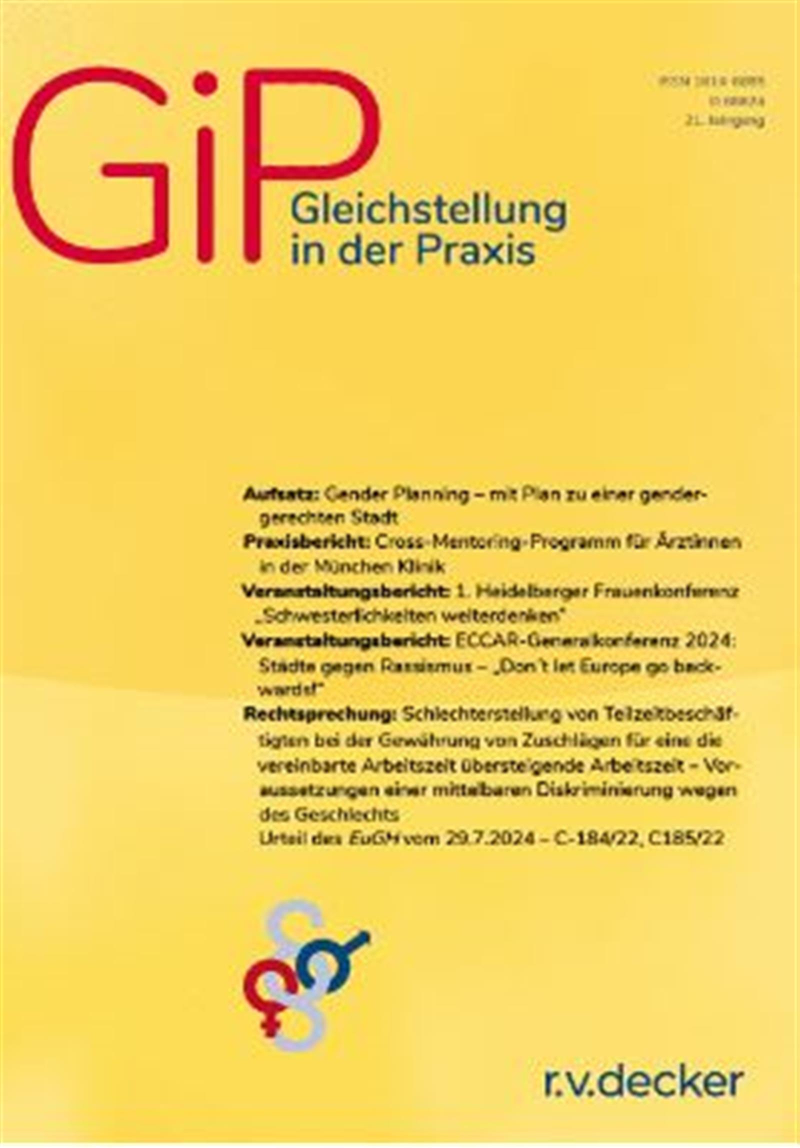 Die Zeitschrift Gleichstellung in der Praxis (GiP) ist eine elektronische Fachzeitschrift, die sich an Gleichstellungsakteur*innen und Interessierte richtet. Sie bietet aktuelle Informationen, Praxistipps, Problemlösungen, Diskussionen aus Wissenschaft und Politik sowie Rechtsprechung rund um das Thema Gleichstellung und Gleichbehandlung.