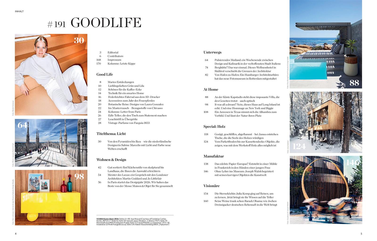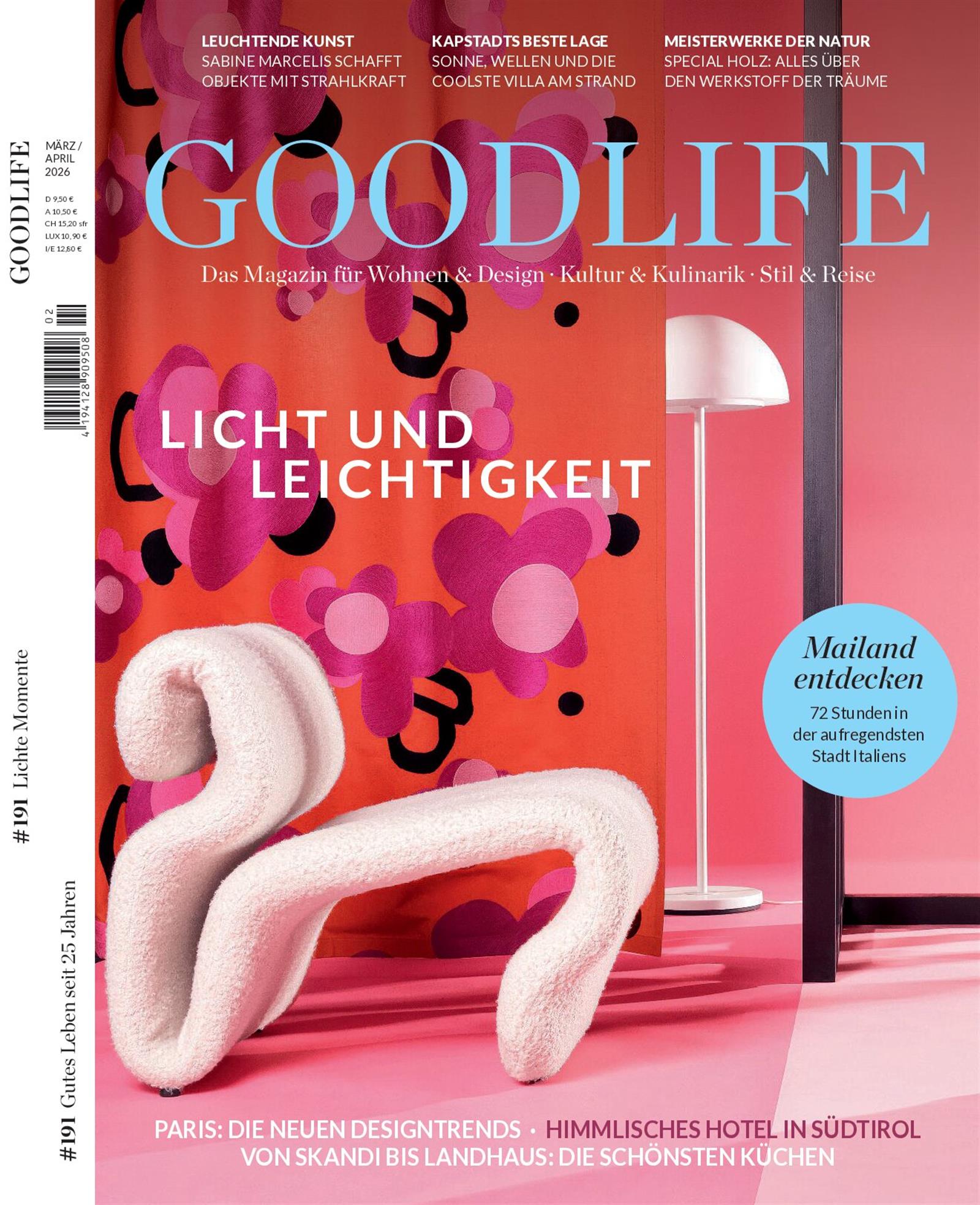 Goodlife WohnDesign bietet eine außergewöhnliche Vielfalt zum Thema Wohnen und Design im gehobenen Bereich. So unterschiedlich die Kulturen der Welt auch sind, so verschieden sind auch die Einrichtungsstile ihrer Menschen, und in dieser Zeitschrift werden sie vorgestellt. Das Magazin ist ein verlässlicher Partner auf der Suche nach Designlösungen und beschäftigt sich intensiv mit der Markenphilosophie von Herstellern.