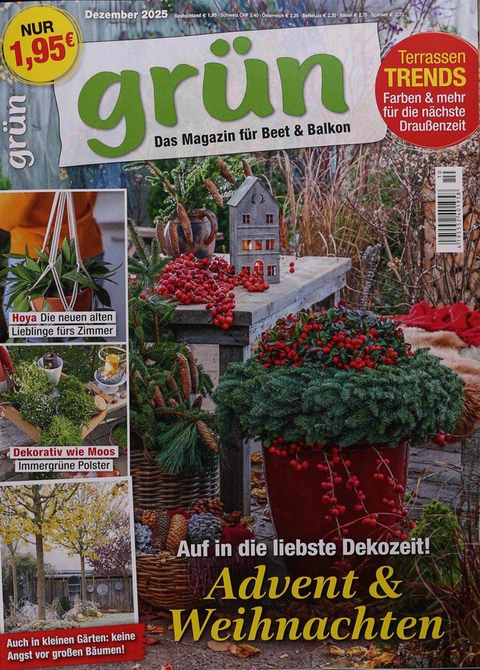Die Zeitschrift Grün kommt aus dem gleichen Verlag wie die Gartenflora verzahnt und widmet sich vor allem jungen Gartenthemen. Im Fokus stehen Ideen für eine gelungene Gestaltung für Garten, Balkon und Terrasse. Themen sind beispielsweise Blumensträuße, Gartenmöbel oder auch der Anbau von Obst und Gemüse, um nur einige zu nennen. Jede Ausgabe deckt eine sehr große Themen-Bandbreite ab.