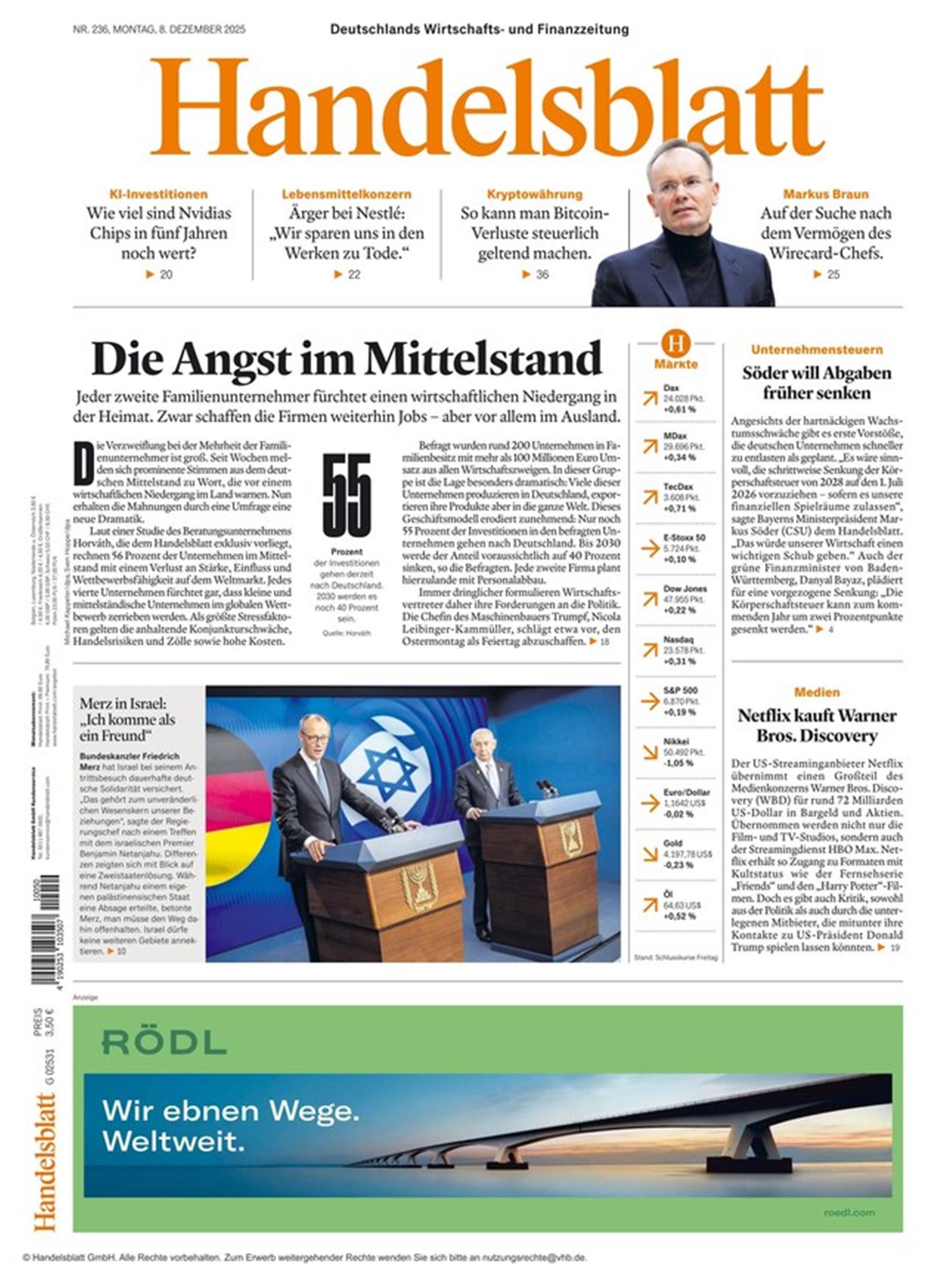 Das Handelsblatt ist die auflagenstärkste Wirtschafts- und Finanzzeitung in deutscher Sprache und ein Pflichtblatt der Wertpapierbörsen in Frankfurt und Düsseldorf. Wo Sie relevante Nachrichten zum Finanzgeschehen erhalten, aktuelle Informationen zu Kursbewegungen, Hintergründen, Investitionsmöglichkeiten bekommen, wenn nicht in einer börsennahen Tageszeitung? Folgen Sie klaren Analysen, lernen Sie von spannenden Interviewpartnern, prüfen Sie Ihre eigene Position in Konfrontation mit starken Meinungsbeiträgen! Unsere bekannten Ressorts wie Wirtschaft & Politik, Unternehmen & Märkte, Finanzen & Börse, Infografiken, Sport versorgen Sie tagesaktuell über Veränderungen und Neugründungen in Wirtschaft und Finanzen. Das Handelsblatt sorgt für fundierte Verbreitung von wirtschaftlichem Sachverstand.