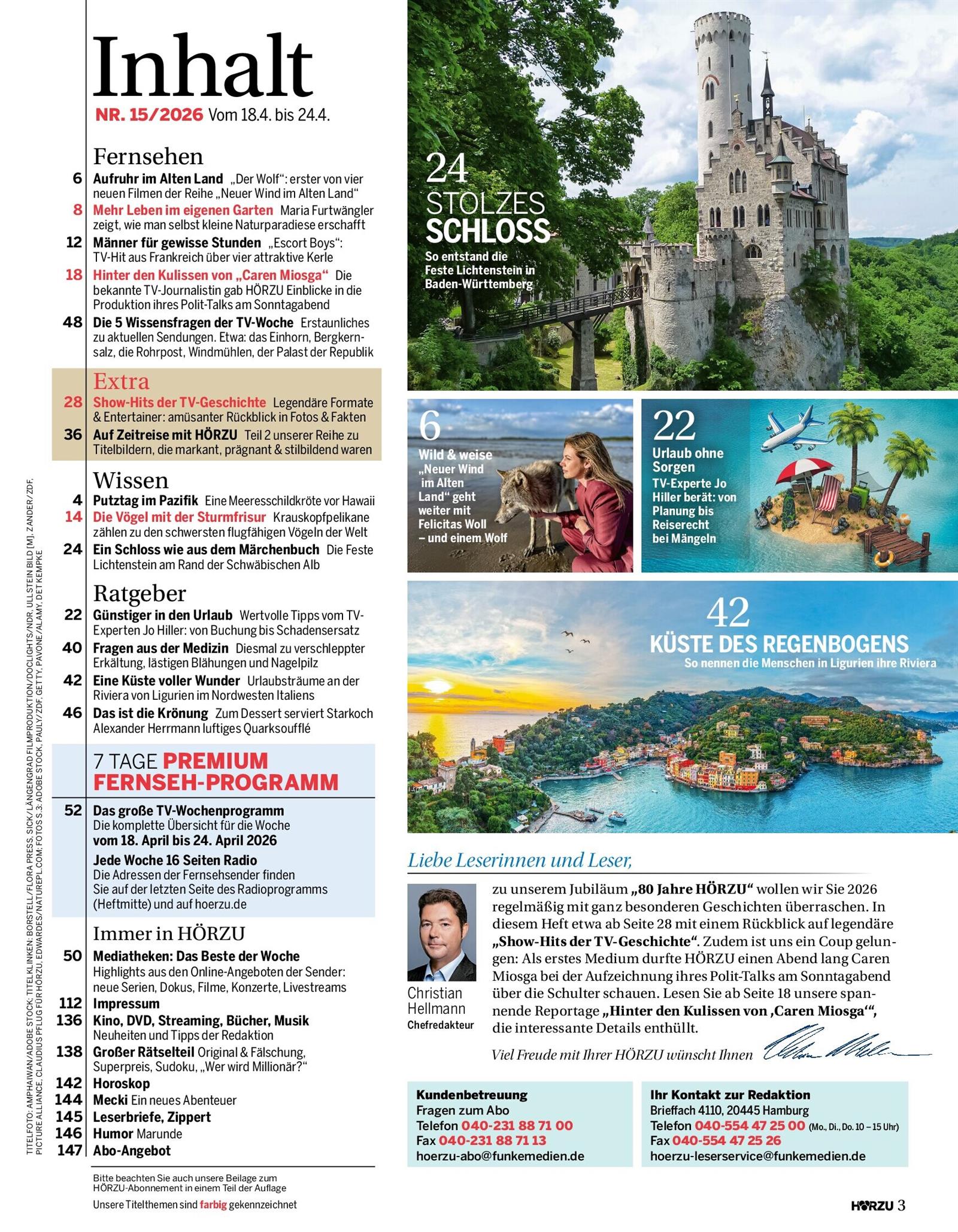 Ich lese die HÖRZU bereits seit 30 Jahren. Ursprünglich nur gekauft wegen des umfangreichen und sehr genauen Radioprogramms hat sich die HÖRZU im laufe der Jahre für mich zur unersetzlichen Programmzeitschrift für Radio UND Fernsehen entwickelt. Nicht zu vergessen der hervorragende und immer abwechslungsreiche Magazinteil wo jede Woche interessante Artikel zu den Themen Film und Fernsehen, Reisen, Gesundheit u.v.m. Platz finden. Eine Zeitschrift die für mich im täglichen Leben nicht mehr wegzudenken ist.