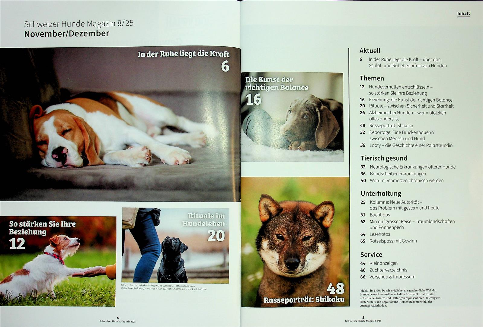 Das Schweizer Hundemagazin berichtet umfassend über alle Themenbereiche, die den Hund betreffen. Die artgerechte Haltung, ausgewogene Fütterung und notwendige Erziehung stehen dabei ebenso im Mittelpunkt wie die Lernbiologie und der Hundesport. Fachlich fundiert berichten Veterinäre über verschiedene Hundekrankheiten, deren Ursachen sowie die medizinischen Möglichkeiten der Behandlung. Gleichzeitig informiert das Schweizer Hundemagazin auch ausführlich über alternative Heilmethoden und wichtige Maßnahmen zur Vorbeugung von vermeidbaren Krankheiten. Ein Jurist gibt Rat und vermittelt praktische Tipps zu Hundeversicherungen sowie einer Hundehaftpflicht. Ausführliche Bildstrecken und Rassevorstellungen werden durch Erfahrungsberichte von Halter*innen zu einer bestimmten Hunderasse ergänzt. Dem Redaktionsteam des Schweizer Hundemagazin liegen die Hundeausbildung und der Hundesport besonders am Herzen, neue Entwicklungen in diesen Bereichen werden aktiv gefördert mit Berichten zu Agility, Ferienkursen oder Prägungsspieltagen. Außerdem setzt sich das Magazin für eine tiergerechte Hundehaltung ein und unterstützt mittels Berichterstattungen und Spendenaktionen den Tierschutz in der Schweiz und im Ausland. Spannende Reportagen berichten über besondere Schicksale, Beziehungen oder Geschichten zwischen Mensch und Hund. Leseraktionen, Gewinnspiele und Wettbewerbe, bei denen attraktive Preise zu gewinnen sind, runden das vielseitige Themenspektrum ab. Das Magazin bietet die perfekte Mischung und ist die Lieblingslektüre zahlreicher Hundefreund*innen im deutschsprachigen Raum.