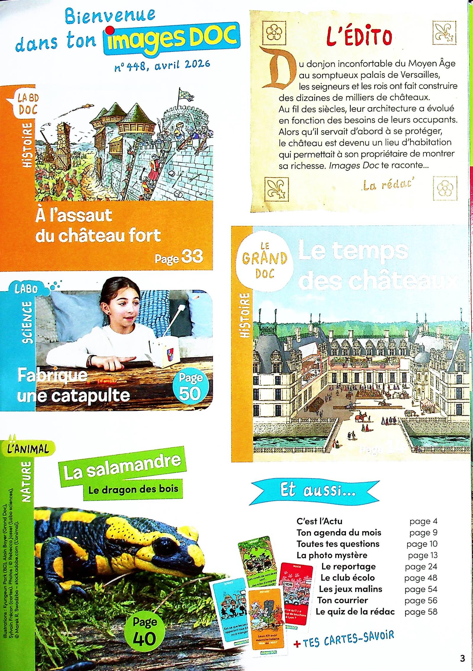 Wissenschaft, Natur, Geschichte… Das französische Dokuheft Images Doc richtet sich an neugierige Kinder von 8 bis 12 Jahren, zur privaten Lektüre bei vorhandenen muttersprachlichen Kenntnissen oder zur Verwendung in der Schule, zum Beispiel im Sprachunterricht. In jeder Ausgabe wird ein großes Thema schwerpunktmäßig behandelt, ein besonderes, geschichtliches Ereignis in Comic-Form dargestellt, ein Tier und seine Lebensgewohnheiten in einer Foto-Doku präsentiert, und verschiedene Wissenschaftsexperimente zum Nachmachen empfohlen. Zudem bringt jede Ausgabe eine schöne Überraschung: Poster, Pläne zum Aufklappen, Beihefter zum Mitnehmen…