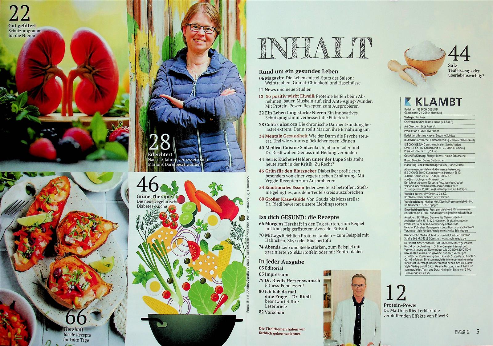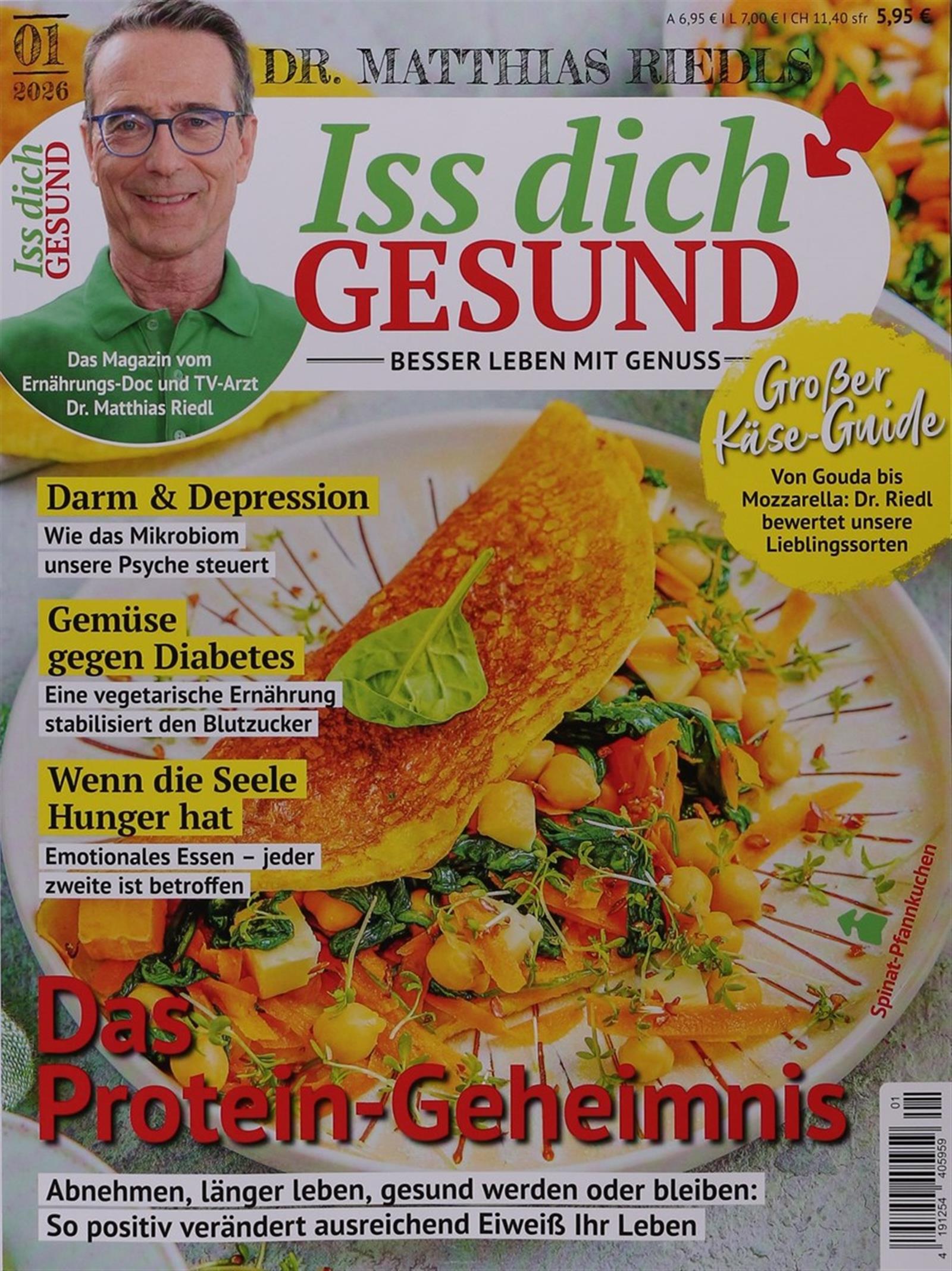 Was Iss dich GESUND so besonders macht? Nicht ausschließlich die Vorbeugung steht im Fokus. Denn mit der richtigen Ernährung lassen sich verschiedene Erkrankungen deutlich verbessern. Echte Personen berichten über ihre Erfolge. Iss dich GESUND hat einen starken Partner an seiner Seite: Dr. Matthias Riedl, einer der „Ernährungs-Docs“ aus der gleichnamigen TV-Sendung und erfolgreicher Autor, ist medizinischer Berater des neuen Magazins.