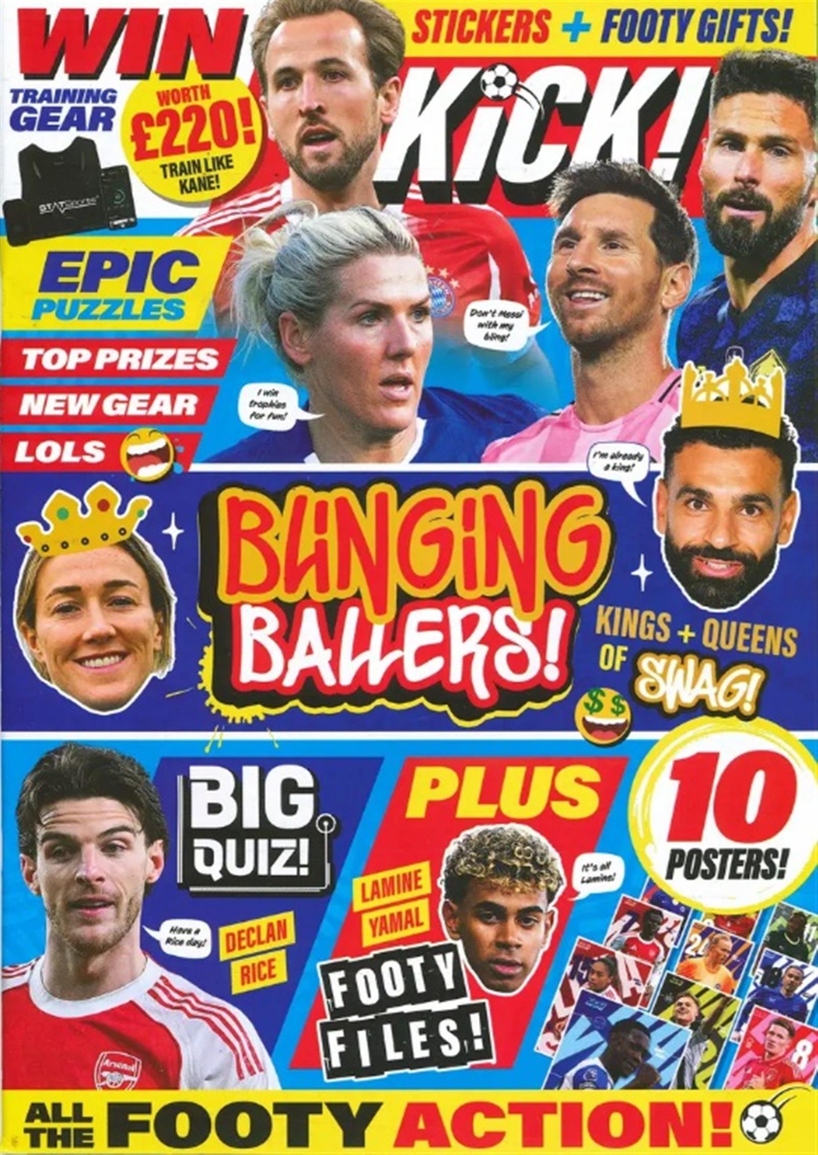 Kick! ist ideal für Kinder und Jugendliche im Alter von 6 bis 12 Jahren. Es stellt ihre Lieblingsstars, ihr Leben, ihre Aktivitäten und Interviews vor. Es enthält außerdem Informationen über die Welt des Fußballs, Spieler- und Mannschaftsfakten, Rätsel, Poster, Wettbewerbe und Produktbewertungen.