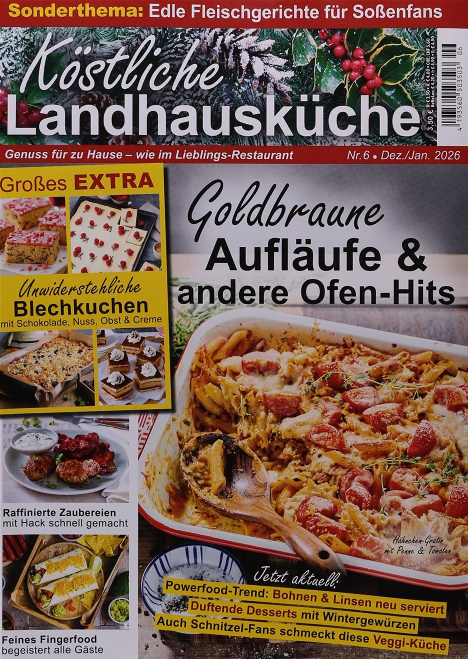 Genuss für zu Hause wie im Lieblingsrestaurant ist das Motto des Kochmagazins Köstliche Landhausküche, das mit leckeren, bodenständigen Rezepten mit besten Zutaten daherkommt. Eine Sammlung an traditionellen Rezepten mit dem gewissen Etwas, das aus den Gerichten mehr als nur Alltagsküche macht, und mit dem richtigen Maß zwischen Machbarkeit und Besonderem. In jeder Ausgabe gibt es neben saisonalen Gerichten und schneller Küche noch ein Schwerpunktthema (Brot, Alpenküche, Snacks…) und das unverzichtbare Backen-Extra, da zu einem guten Essen auch der perfekte Nachtisch gehört.