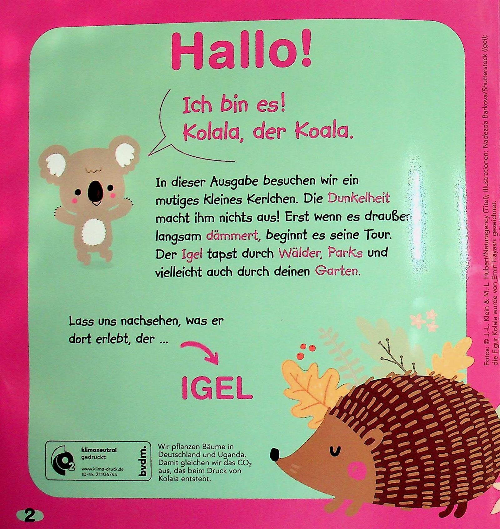 Kolala ist ein neues, buntes Magazin für Kinder ab 2 Jahren. Mit Kolala gehen bereits die Allerkleinsten auf spannende Entdeckungsreise in die große weite Welt der Tiere. Kolala zeigt Ihrem Kind in vielen spannenden Geschichten das aufregende Leben der Tiere. Großformatige Bilder mit detailreichen Beschreibungen laden zum Staunen und Verstehen ein und fördern damit spielerisch die Freude am Lernen bei Ihrem Kind.