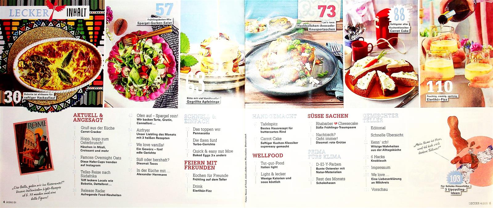Abgerundet mit Stippvisiten bei Starköchen, die einen Einblick in ihre Koch-Fantasien geben, der LECKER-Hausbar für den guten Drink und der kleinen, aber feinen Rubrik rund um den Kaffeegenuss lässt das Magazin fast keine kulinarischen Wünsche offen.