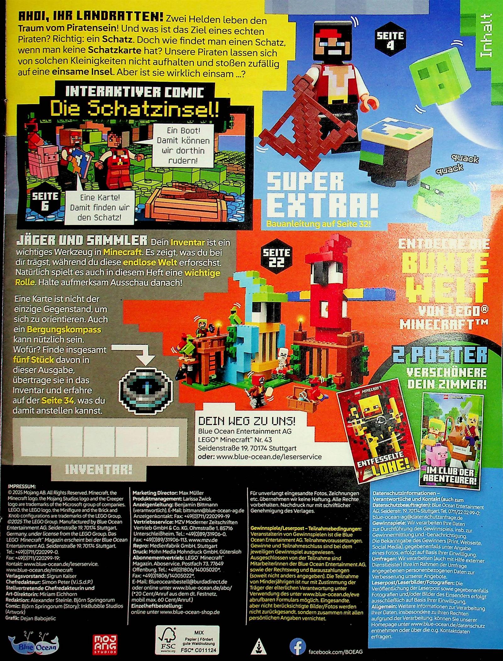 Die Ausgabe bietet ein Minecraft-Abenteuer mit interaktivem Comic, einem starken Freund:innen-Quartett auf dem Weg ins End, einer Bauanleitung als Extra, Infos zu Jäger:innen und Sammler:innen, einer LEGO-Minecraft-Welt zum Entdecken, fünf versteckten Enderaugen sowie zwei Postern zur Zimmerdeko.