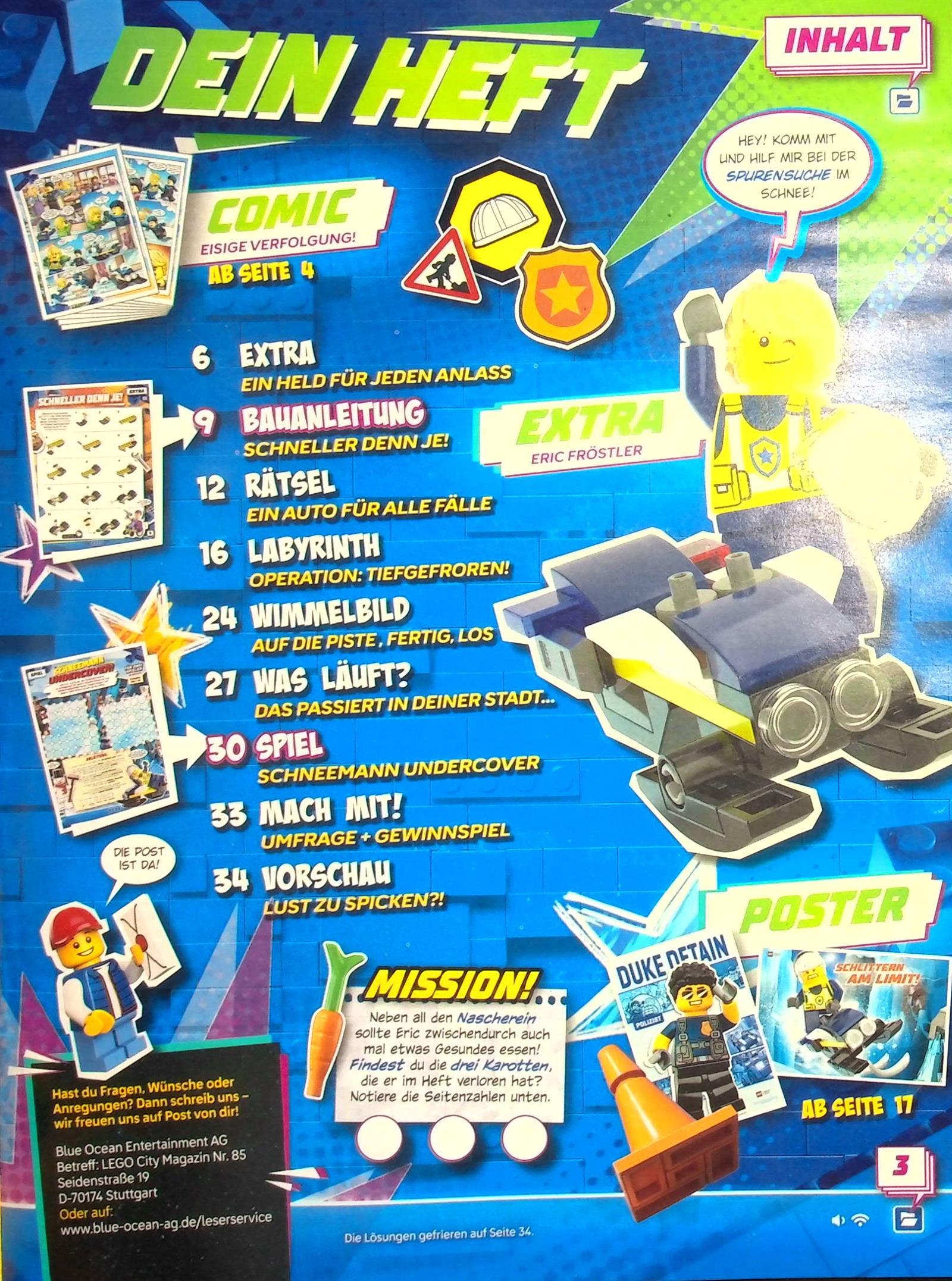 Mit Lego City - das Magazin können die Leser die Welt der großen LEGO Stadt entdecken. Jedes Heft hat ein neues spannendes Thema. Ob Gangsterjagd mit Polizist Ember oder ein Tag auf der Baustelle, Comic, Rätselseiten, Poster und Activity versprechen Spaß und Unterhaltung. Jede Ausgabe mit einem original LEGO City Spielset!