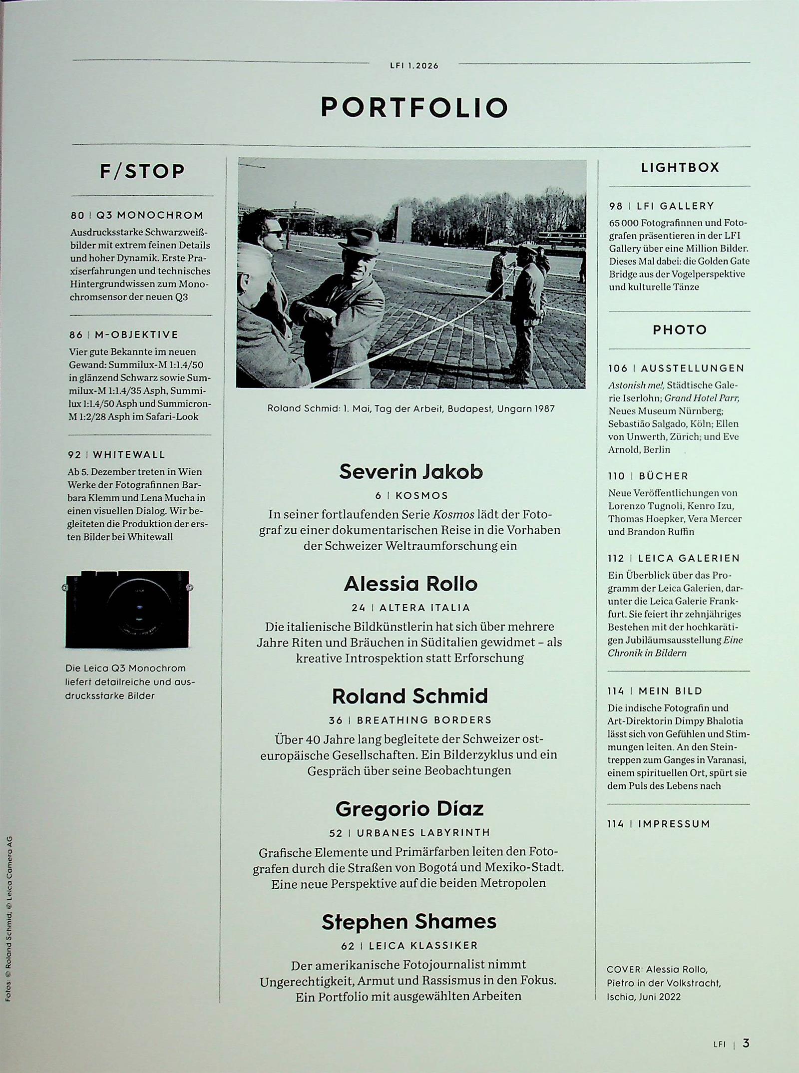 Das renommierte und qualitativ sensationell gefertigte Magazin präsentiert LFI Portfolios und Reportagen herausragender Leica – Fotografen, von klassischer Fotografie, bis zu Meistern der zeitgenössischen Fotografie hin zu jungen Talenten und den besten Fotografen aus der LFI-Lesergalerie.