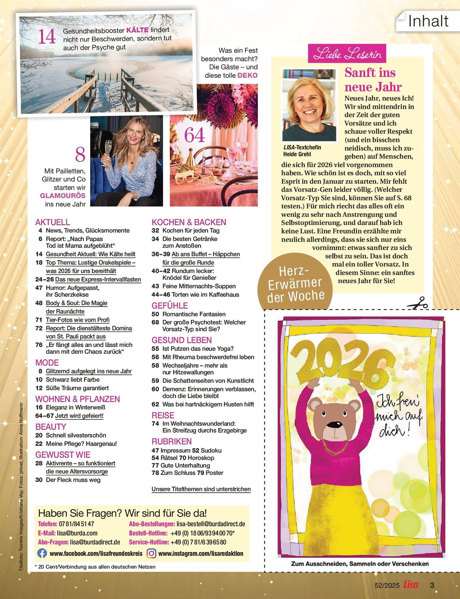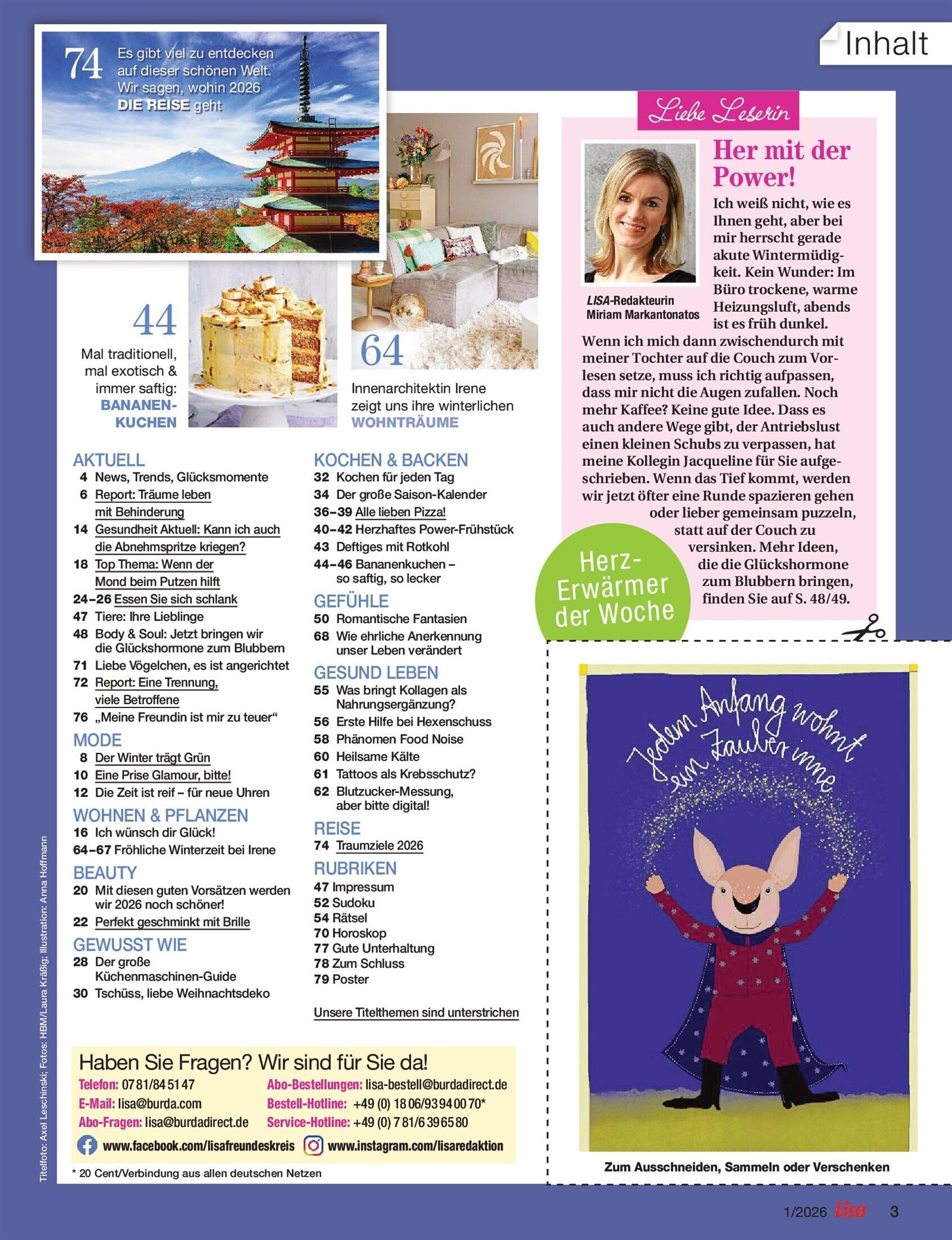 Die Zeitschrift Lisa ist sehr intersant und es stehen viele schöne Rezepte und vieles zu lesen drin was mich sehr intresiert, ich kann die Zeitschrift Lisa weiter empfehlen. Mit freundlichen GrüßenSandra Gomoll