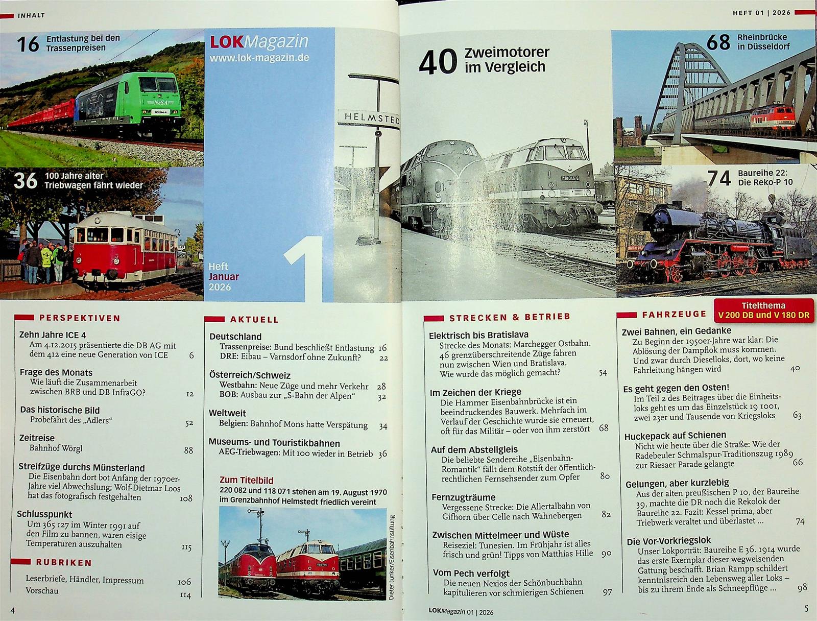 LOK Magazin stellt neue Baureihen und sehenswerte Bahnstrecken vor, informiert über neue Entwicklungen im Schienenverkehr und beleuchtet in bebilderten Reportagen das aktuelle Bahngeschehen in Deutschland, Österreich und der Schweiz. Anekdoten und Erlebnisberichte erinnern an die Vergangenheit der Eisenbahn und runden das Magazin ab.